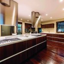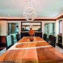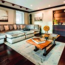 The capacious living area, replete with a wet bar, plush sofas, and a fireplace, flows into a dining space seamlessly integrated with an ultra-modern kitchen featuring a central island. This kitchen stands fully equipped with professional-grade appliances and tools to cater to every culinary need.