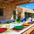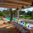 The serene aesthetics of the interiors extend to the outdoor areas. Here, you'll find a sun-drenched private pool, two beautifully furnished patios, numerous dining tables for al fresco meals, a barbecue area complete with a wood-burning oven, and meticulously manicured gardens, including a vegetable patch. These idyllic spaces provide the perfect setting for families and friends to unwind and enjoy a timeless vacation in paradise.