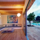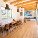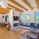 The main villa offers a spacious living room adorned with a generous L-shaped sofa and a dining area featuring a large table that comfortably accommodates up to 14 guests. A floor-to-ceiling glass sliding door seamlessly connects the living room to the outdoor spaces, allowing for a harmonious flow between indoor and outdoor environments. The combination of a muted color palette, blond wood floors, exposed beam ceilings, and a modern fireplace creates a warm and casual yet elegant ambiance. Adjacent to the living area is a fully equipped kitchen.