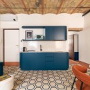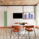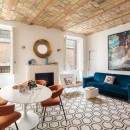 The open-plan lounge and kitchen feel like the backdrop to a fashion shoot. Hexagonal floor tiles, a daring choice, cleverly expand the space while tying together key design elements. They beautifully echo the vaulted brick ceiling above. Add in a Saarinen dining table and a reeded Mutina fireplace, and you have a retro-futuristic dream space—ideal for hosting an aperitivo with friends.