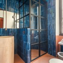 The bathroom delivers even more drama. Cobalt Majolica tiles sweep across the walls in a wave-like pattern, bringing spa-level serenity, while a Crittall-style shower frame adds a striking, masculine edge. Underfoot, peach-resin flooring—Pantone’s 2024 colour of the year—offers a warm, modern contrast to the exposed ironwork beams.