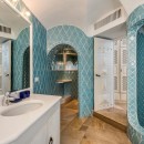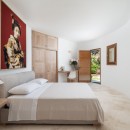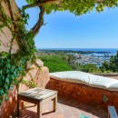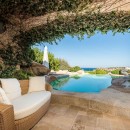 The living room opens to a covered terrace, providing guests with a perfect spot to soak in the stunning views of the bay. The villa’s lush Mediterranean garden, rich in local flora and artistic accents, creates serene corners ideal for relaxation and contemplation.