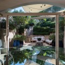 The spacious, fully-equipped kitchen seamlessly flows into a bright, airy living room featuring a cozy fireplace and a refined formal dining area. For a more open-air experience, a covered outdoor dining space nestled in the shaded garden provides an enchanting setting for al fresco meals.