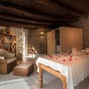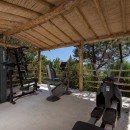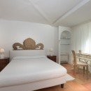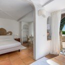 The six guest bedrooms are situated on two sides of the villa. On one side, there is a master bedroom with a four-poster bed, a study with a fireplace, and a luxurious marble bathroom with a shower and a bathtub. Additionally, there is a double room with a bathroom and shower, a double suite with a living area and an en-suite bathroom with a shower located at the pool level. The villa also offers a double bedroom with an en-suite shower room and a family suite with two bedrooms (one double and one twin) and two private bathrooms, along with a terrace (the suite can be converted into two separate and independent bedrooms). Furthermore, there is an outdoor gym area and a wellness room equipped with a sauna and a massage table.
