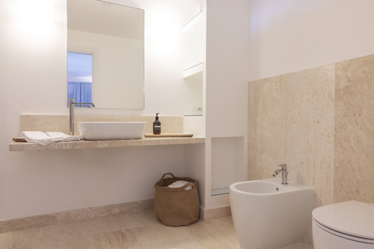 The villa itself boasts a ground floor comprising an elegant entrance hall, a spacious living room, four inviting bedrooms, three well-appointed bathrooms, a fully-equipped kitchen, and ample outdoor spaces to soak up the Mediterranean atmosphere. A fifth bedroom, featuring a comfortable sofa bed and an ensuite bathroom, is located downstairs with direct access from the garden, offering privacy and convenience for an additional guest.