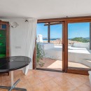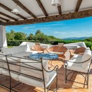 A bright, elegant apartment featuring a spacious living room with a fireplace, sea-view verandas, a kitchen with outdoor access, and a large dining room opening onto a panoramic terrace. The sleeping area includes three double bedrooms with private bathrooms and a twin room with bunk beds, accompanied by an adjacent bathroom.