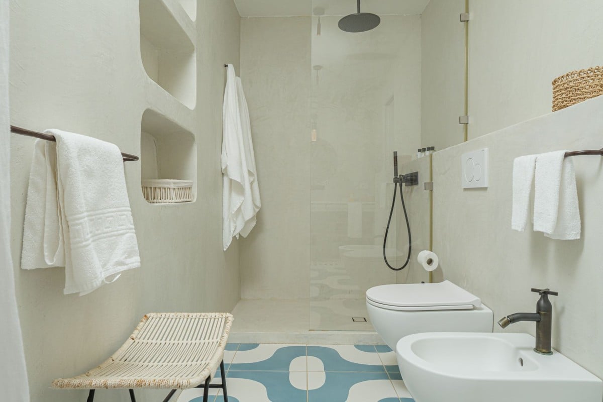 Bedroom 1: Lower Ground floor bedroom with a double bed, A/C, WiFi, access to the terrace, sea view, and en-suite bathroom with shower, vanity and WC. 2 guests maximum. (Outdoor access)