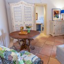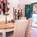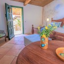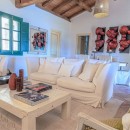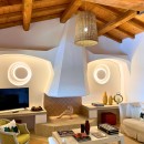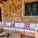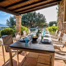 The refined villa showcases rustic stone walls and inviting wooden beams, harmoniously complemented by modern furniture and exquisite artworks. Its spacious living room, complete with generous seating, and a contemporary, fully equipped kitchen cater to guests desiring autonomy in meal preparation, while an elegantly furnished lounge on the panoramic outdoor patio comfortably accommodates groups of friends or extended families.