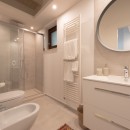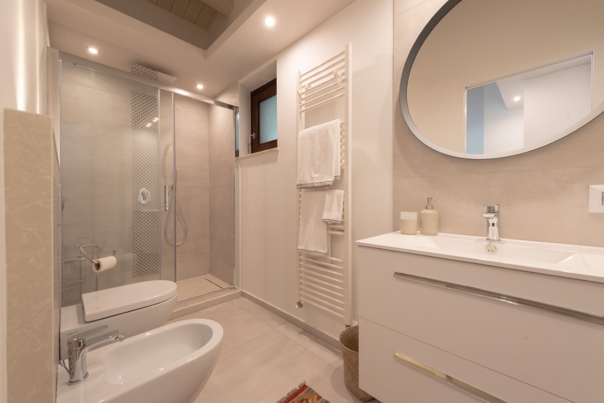The open-plan living and kitchen area is designed for comfort and conviviality, featuring a cozy lounge corner and a fully equipped modern kitchen, perfect for sharing moments in complete ease. The villa features three air-conditioned bedrooms—two double bedrooms and one twin bedroom — with independent external access, each equipped with its own private bathroom and spacious walk-in shower, ensuring privacy and comfort for all guests.