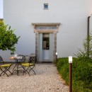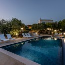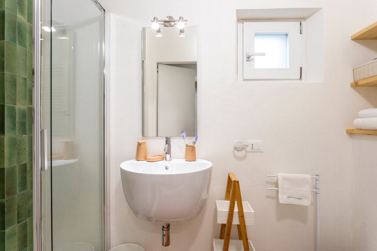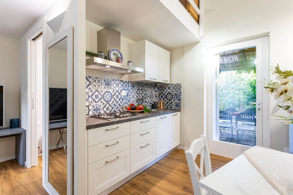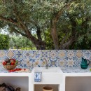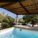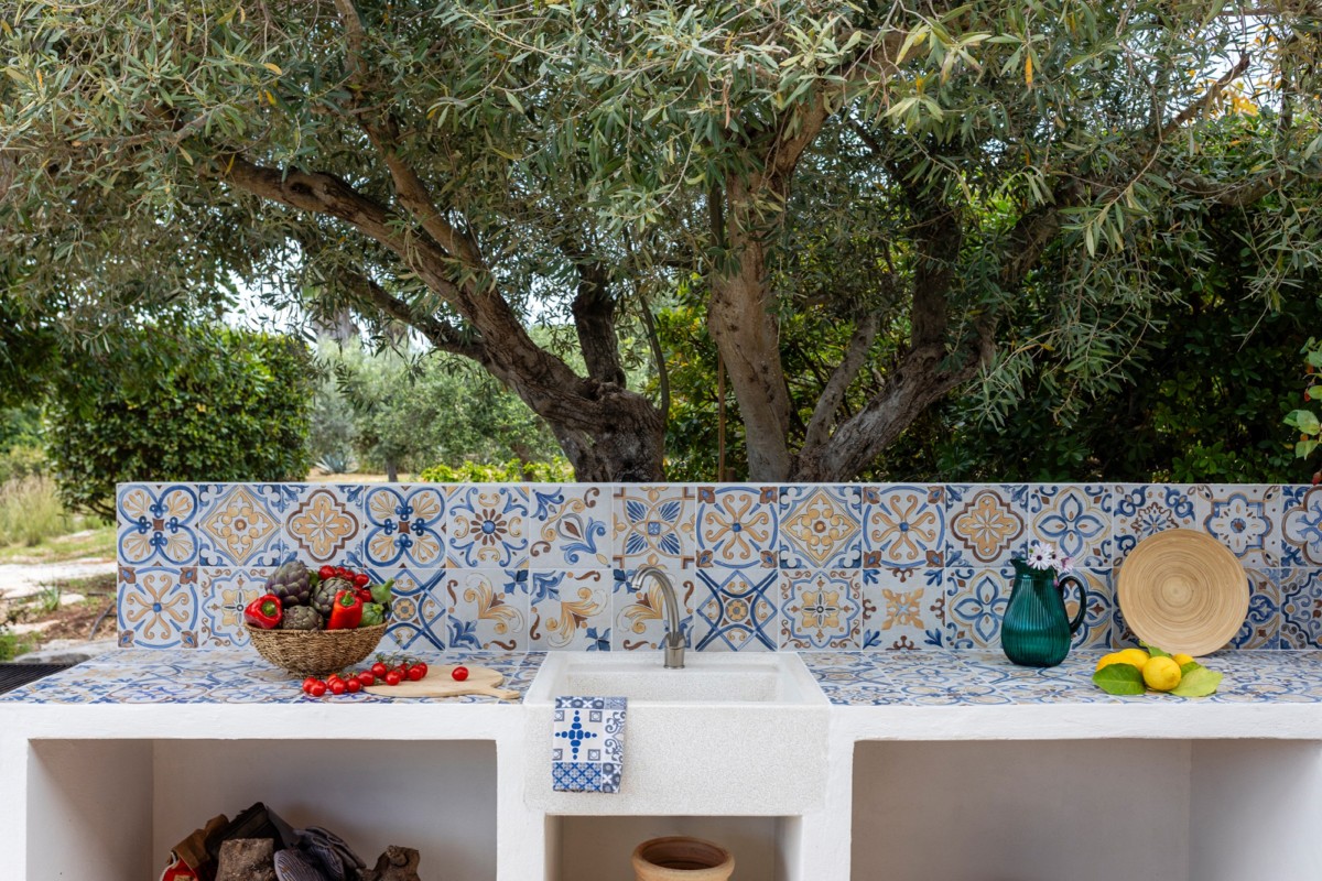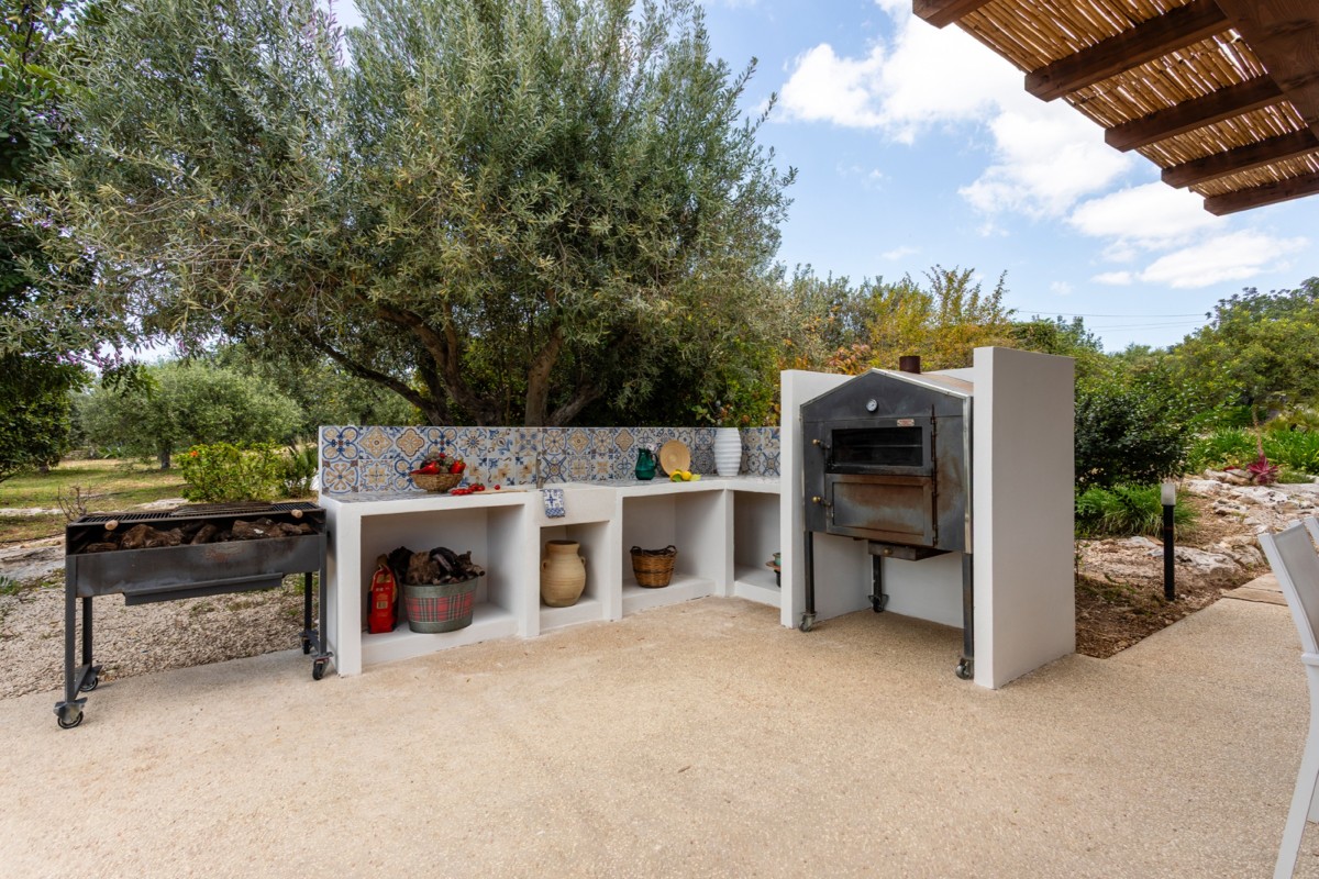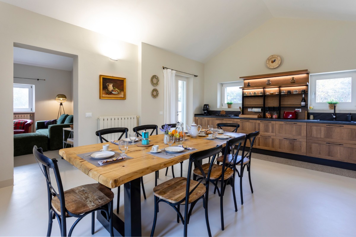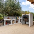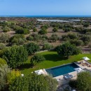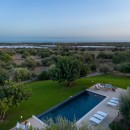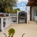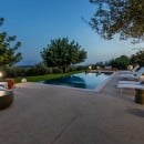 Outside, the villa opens onto an enchanting garden surrounded by olive and citrus trees. Guests can enjoy a stunning swimming pool, a jacuzzi, and beautifully furnished outdoor spaces with sun loungers and umbrellas. An outdoor dining area, directly connected to the kitchen, offers the perfect spot to enjoy meals while admiring views of the garden, the pool, and the sea in the distance.