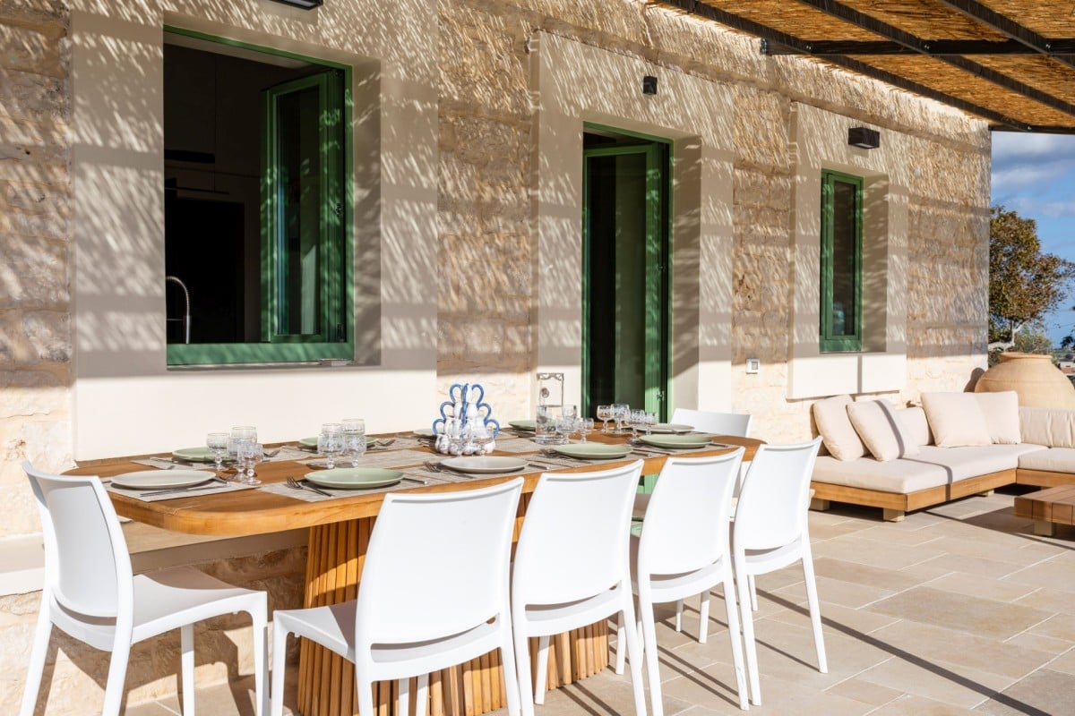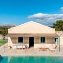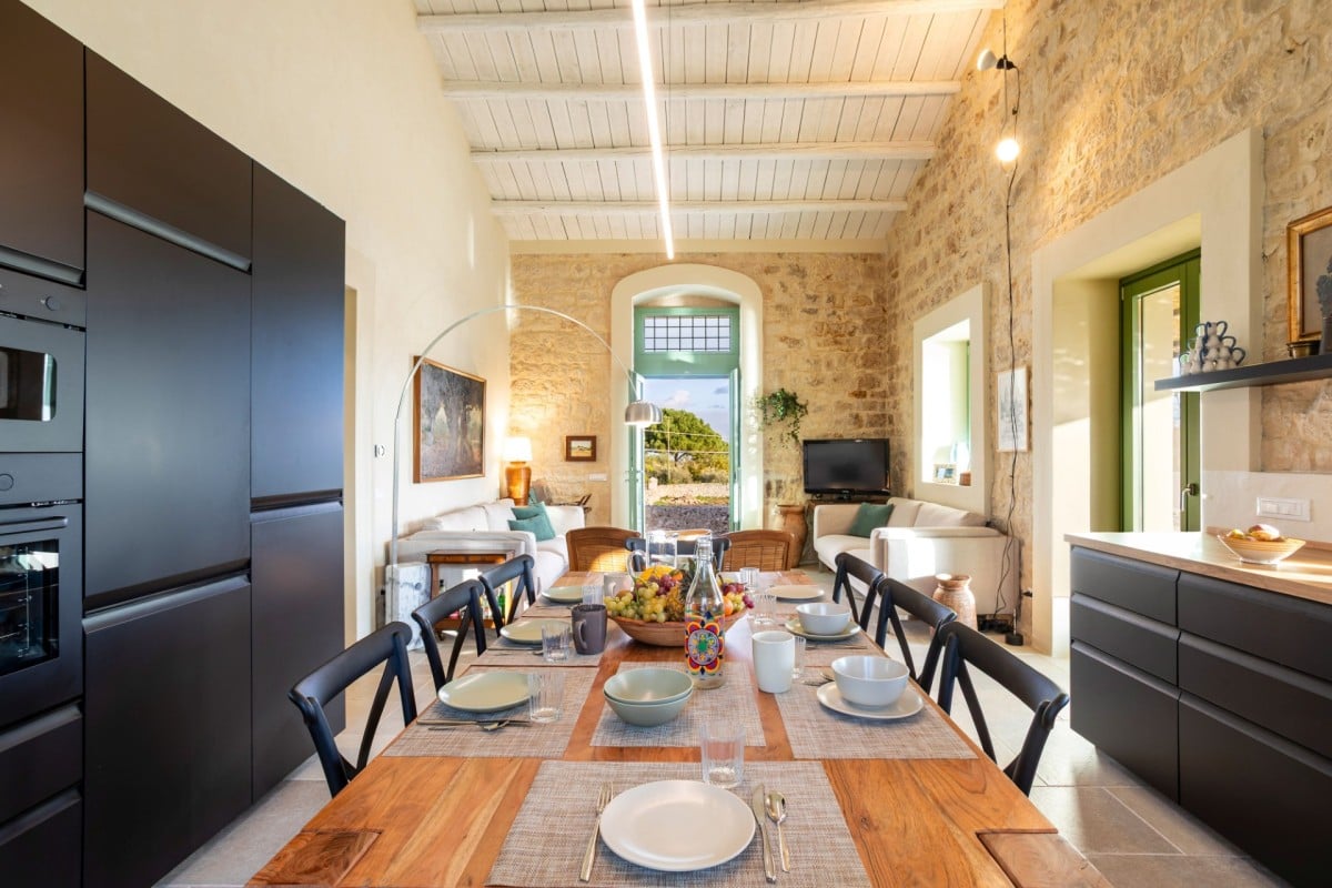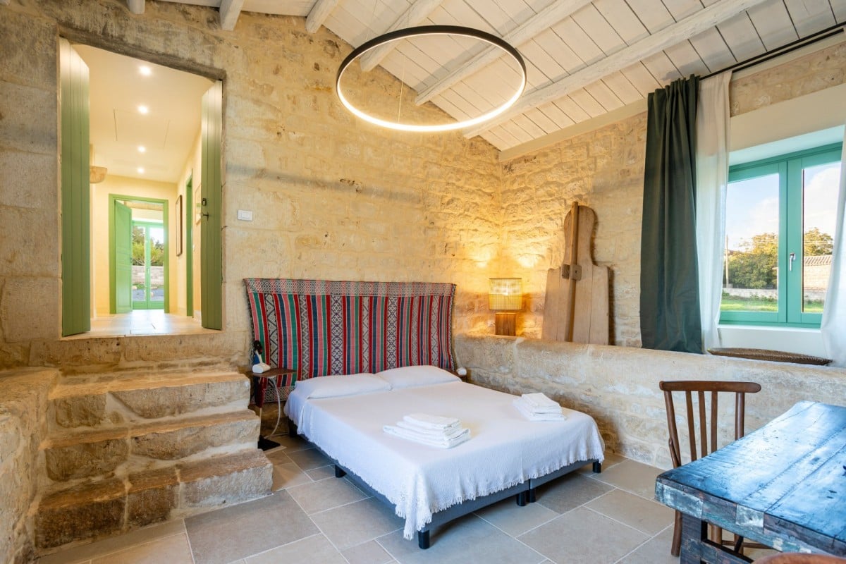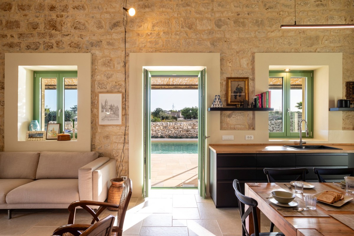 Inside, Casa Gna Razia reflects Sicilian tradition reinterpreted with contemporary style. Stone walls, natural materials, and simple yet welcoming furnishings define bright and airy interiors, enhanced by large windows overlooking the patio and pool. The living area is designed for comfort and conviviality, while the five air-conditioned double bedrooms and four bathrooms ensure privacy and tranquility for every guest, offering the perfect environment for rest and rejuvenation.