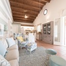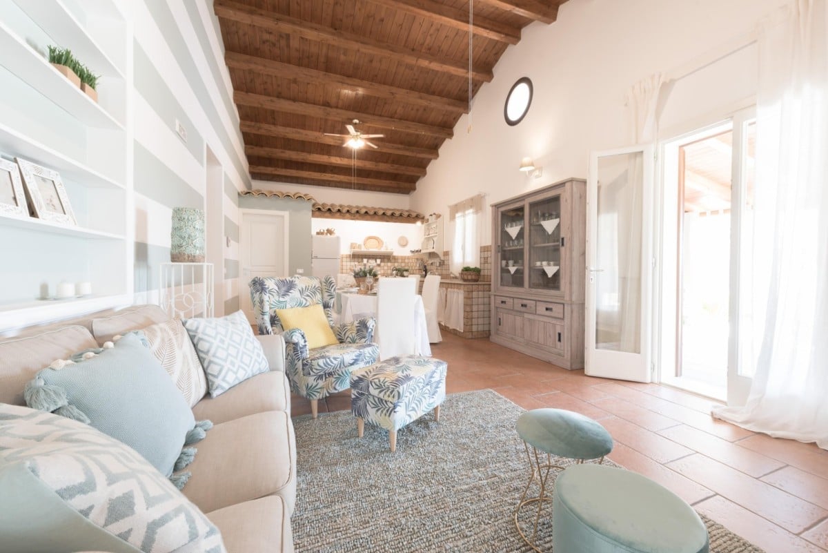 The villa offers bright and spacious interiors, featuring three bedrooms (two doubles and one twin), two bathrooms, and a large open-plan living area with a fully equipped kitchen, complete with all modern comforts.