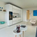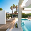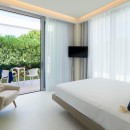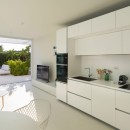 The villa’s design is modern, clean, and understated, with an emphasis on natural light that fills every room. The open-plan living room features a lounge area, a dining space, and a fully equipped kitchen, while large glass doors open out to the garden and pool area, creating a seamless connection between indoor and outdoor living. The sleeping area includes two bright double bedrooms, each with its own en suite bathroom, ensuring privacy and comfort for guests.