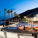 The villa includes seven double bedrooms, each with an en-suite bathroom, as well as a large, light-filled living area that opens to the outdoors through full-height windows. The living space consists of a TV area, sitting and dining areas, a kitchen, and a guest bathroom. The property is equipped with air conditioning, Wi-Fi, satellite TV, a safe, dishwasher, washing machine, dryer, and an outdoor kitchen.