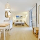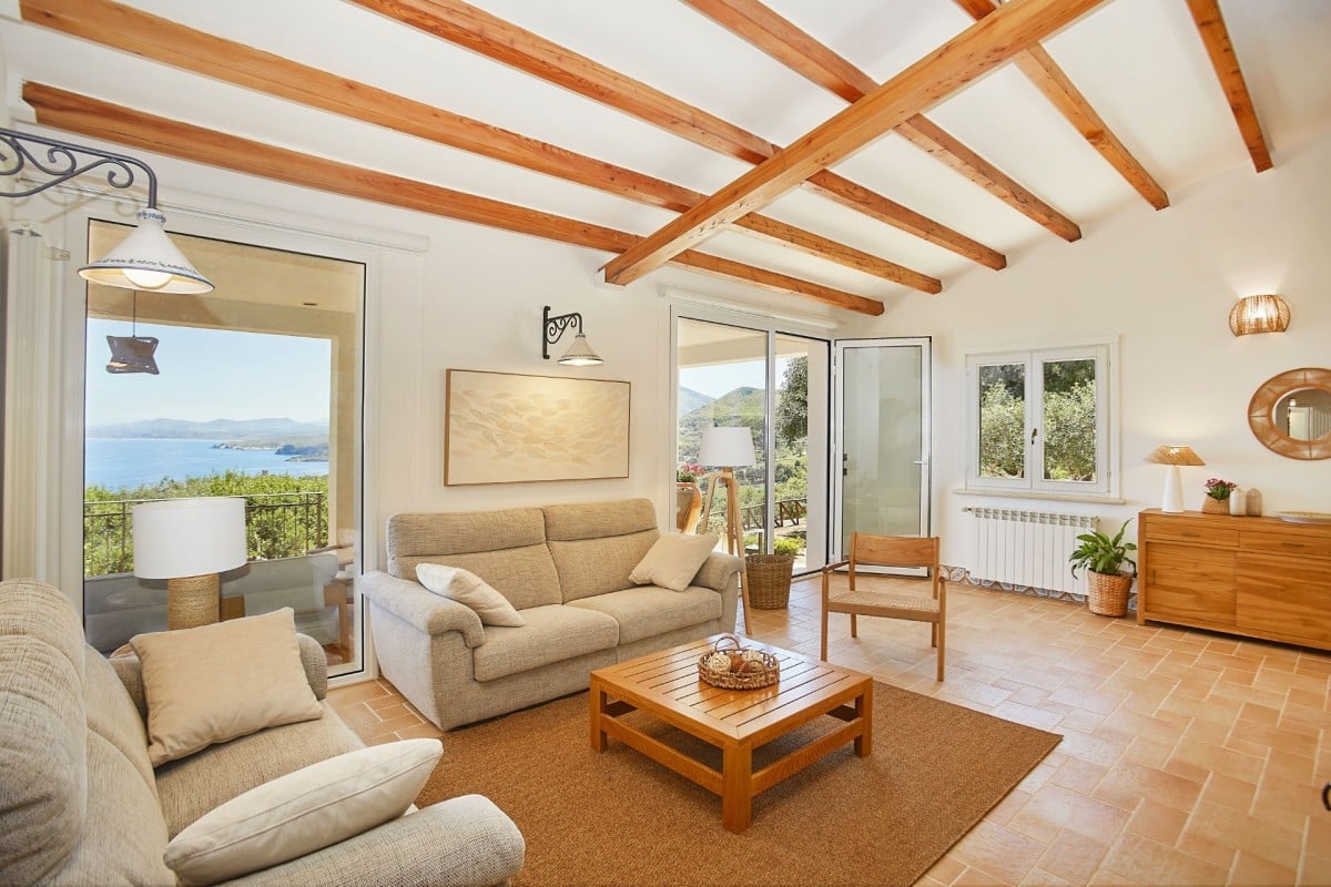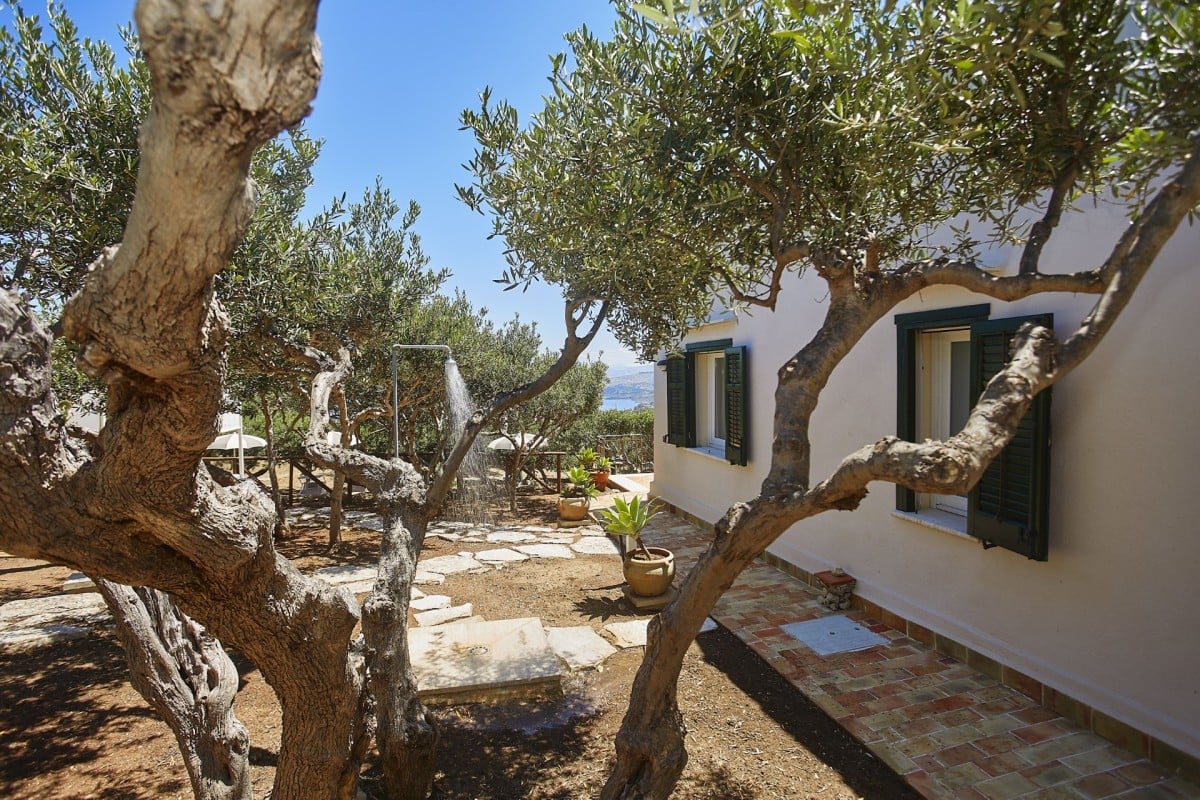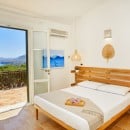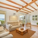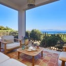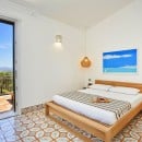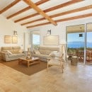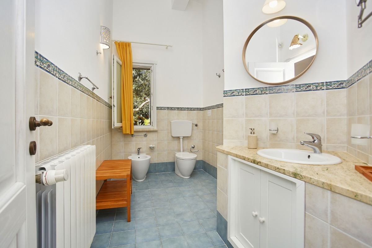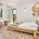 The bright and spacious living area seamlessly combines a dining space, a fully equipped kitchen with a refrigerated wine cellar, and a comfortable lounge. A wide corridor leads to the sleeping quarters, which include six light-filled queen bedrooms offering beautiful views of the sea and gardens. These rooms feature traditional handmade tile floors, some with satellite TV, and are served by four bathrooms with showers. A seventh queen bedroom with an en-suite bathroom is located in a separate annex, accessible from the outside, ensuring privacy and comfort.