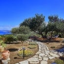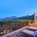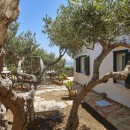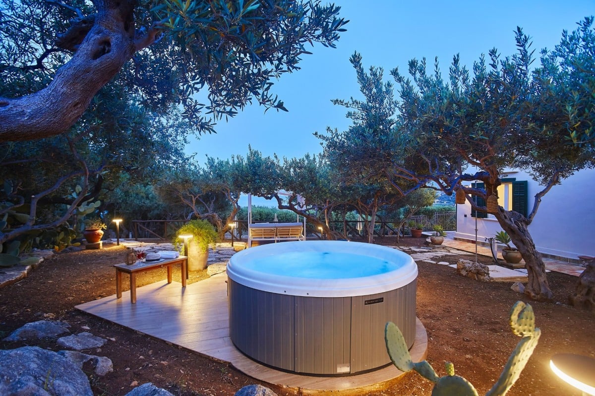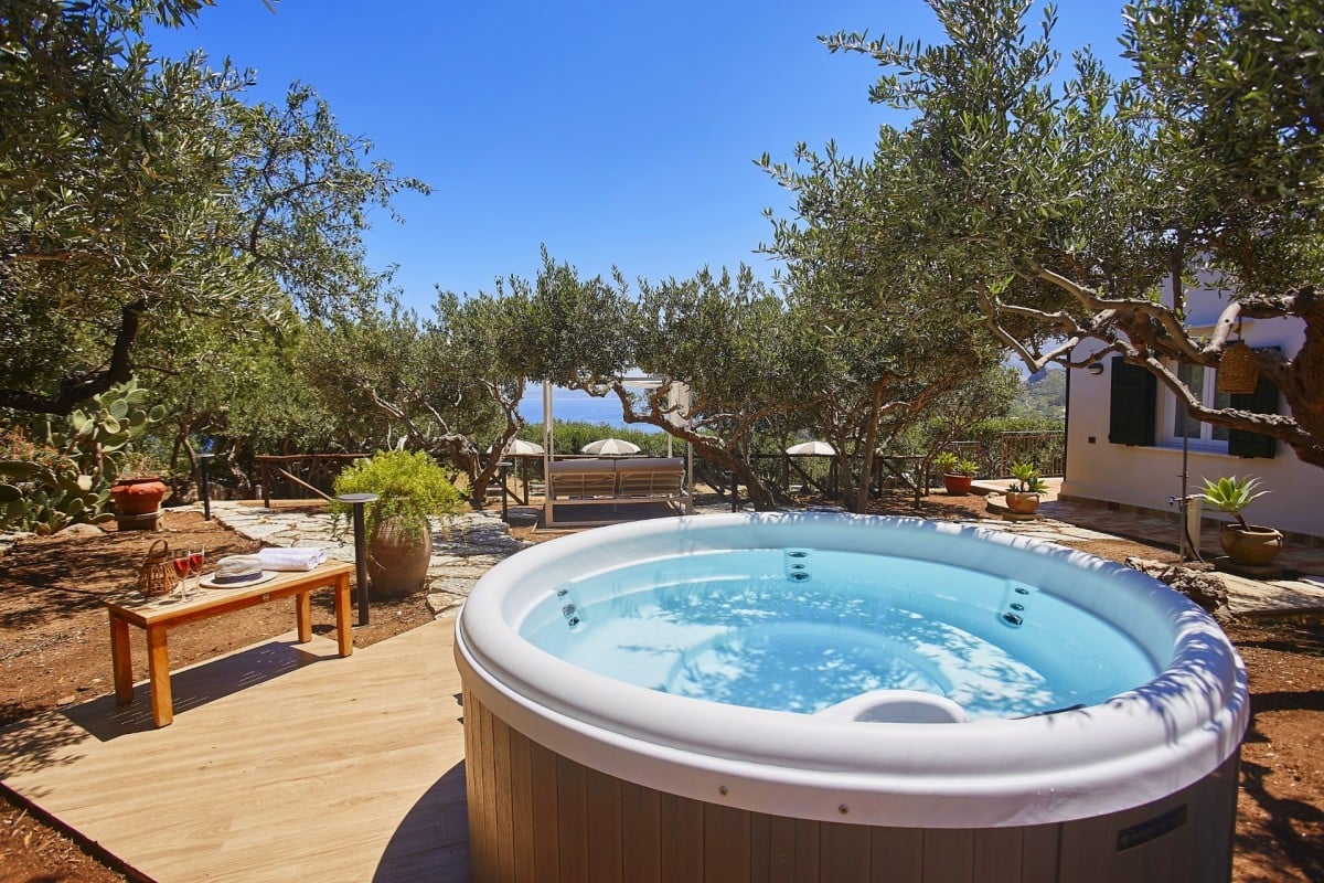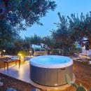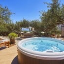The beautifully landscaped grounds include a spectacular swimming pool and a Jacuzzi nestled among olive trees, creating an idyllic setting for relaxation. The pool is illuminated at night, offering the magical experience of swimming under the stars.