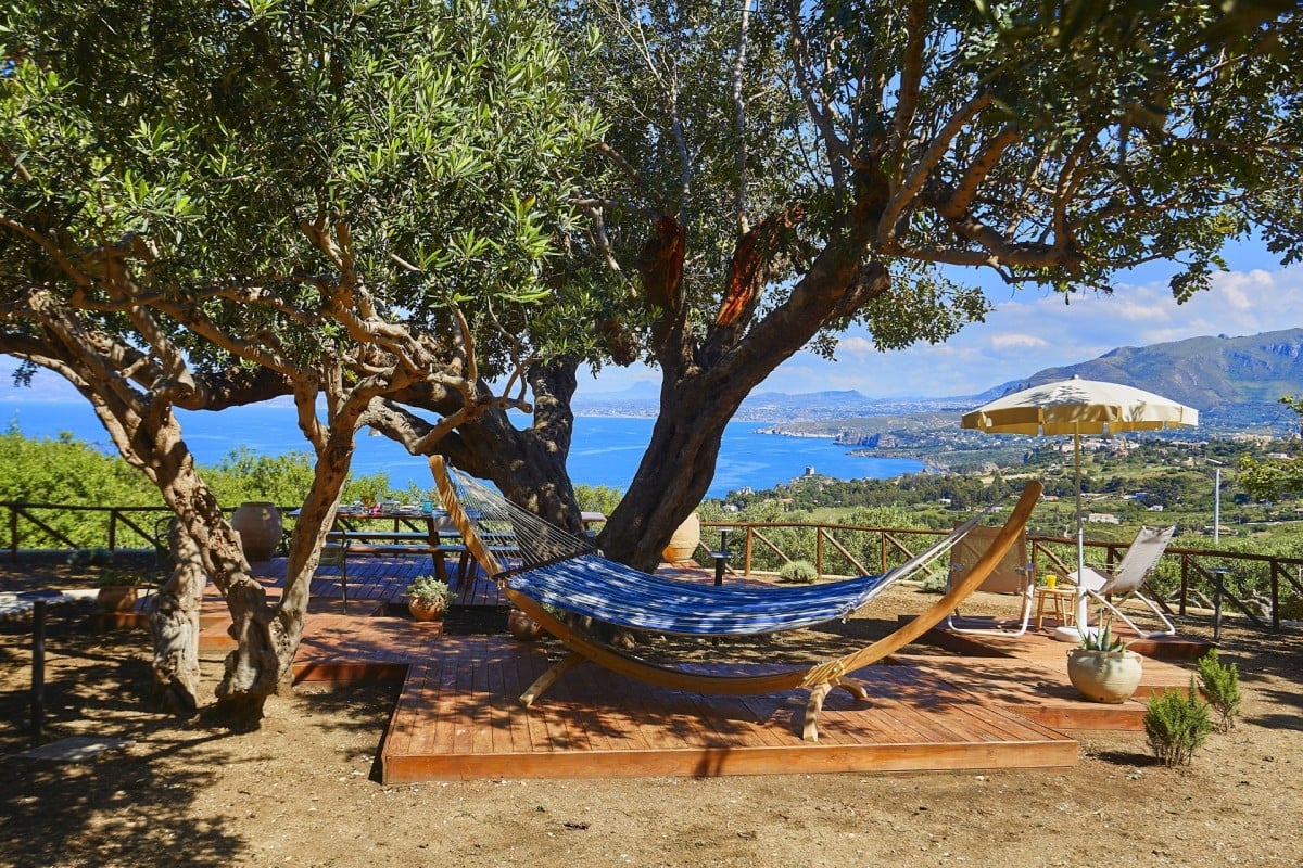 Set within the stunning Zingaro Nature Reserve, the villa boasts breathtaking views of turquoise waters and unspoiled coastline. The main lounge opens onto a magnificent covered terrace, perfect for sunset cocktails or relaxing on cushioned seating. Outdoor spaces are designed for both leisure and entertaining, featuring sun loungers, a dining area, barbecue, yoga space, and shaded areas beneath a majestic carob tree, complete with a hammock.
