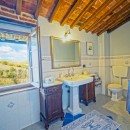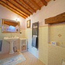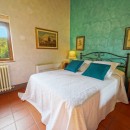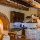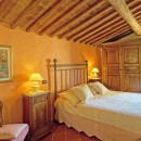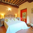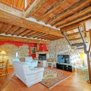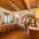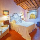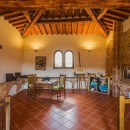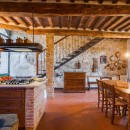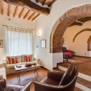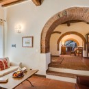 The exterior of the villa includes traditional terraces and patios in addition to the pool. There is a large al fresco dining terrace with an outdoor kitchen and all of the ground floor rooms open to the garden or terrace. Indoors, visitors will be able to enjoy the wooden beams, terra cotta floors, and brick arches that are iconic in Tuscan architecture. With comfortable furnishings, all of the shared living spaces are warm and welcoming.