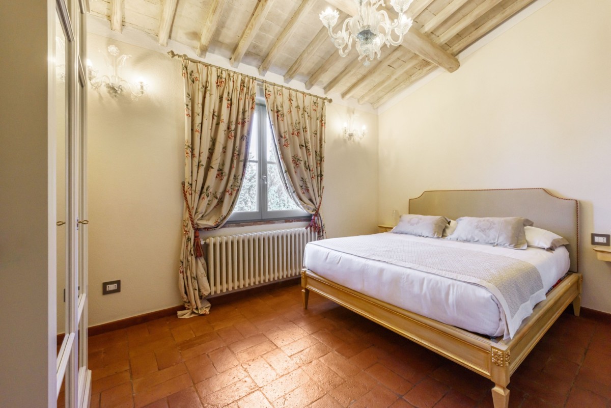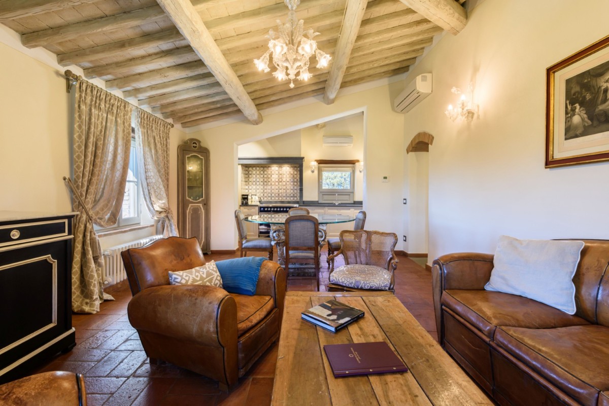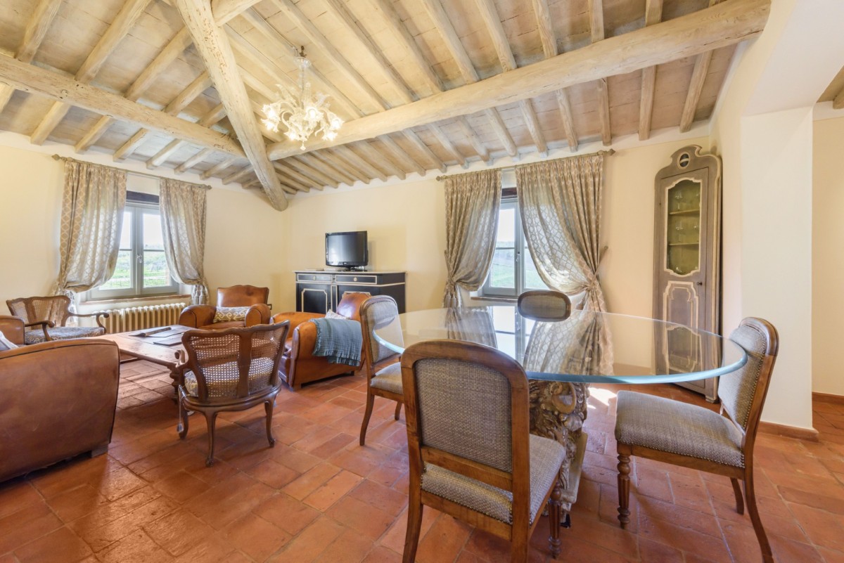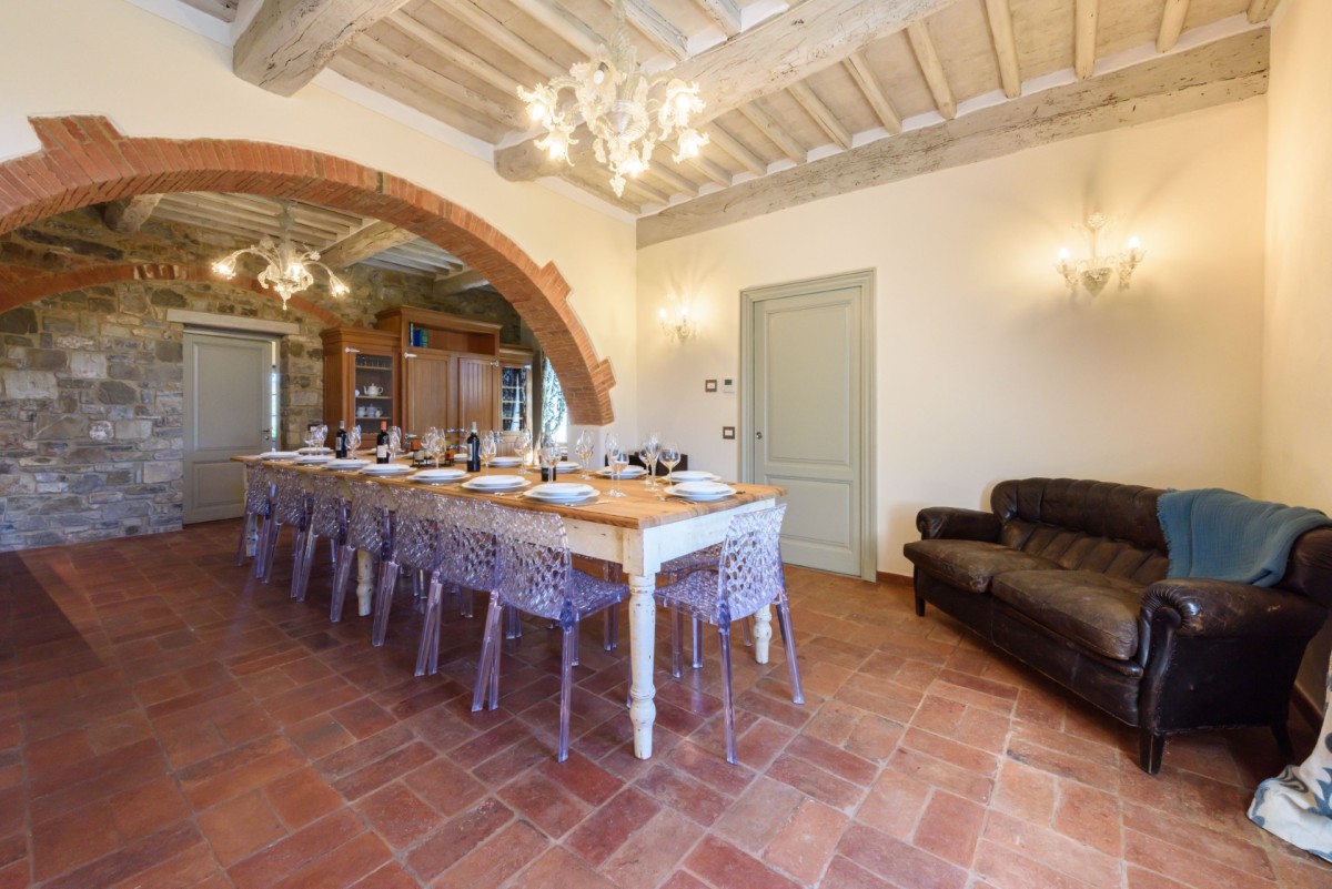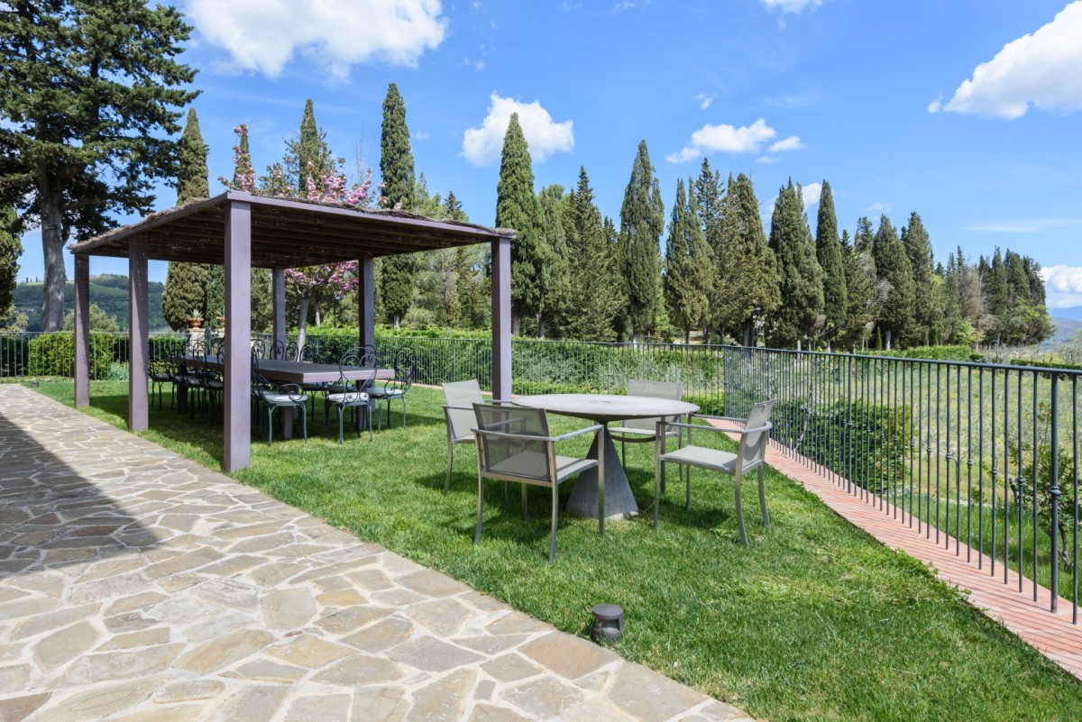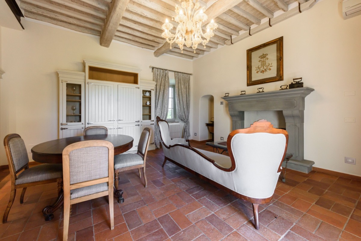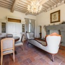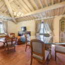 Nestled within a beautifully landscaped garden, the property features expansive lawns, a comfortable lounge area with sofas and armchairs, and a covered outdoor dining space with seating for 16 and a barbecue—ideal for alfresco meals with a view. On a lower terrace, guests will find a magnificent 12 x 6 m pool complete with sun loungers and parasols, offering an idyllic spot to relax and soak up the Tuscan sun. Adjacent to the villa, a private restaurant reserved exclusively for guests can be accessed directly from the garden, providing a unique dining experience.