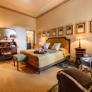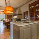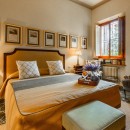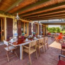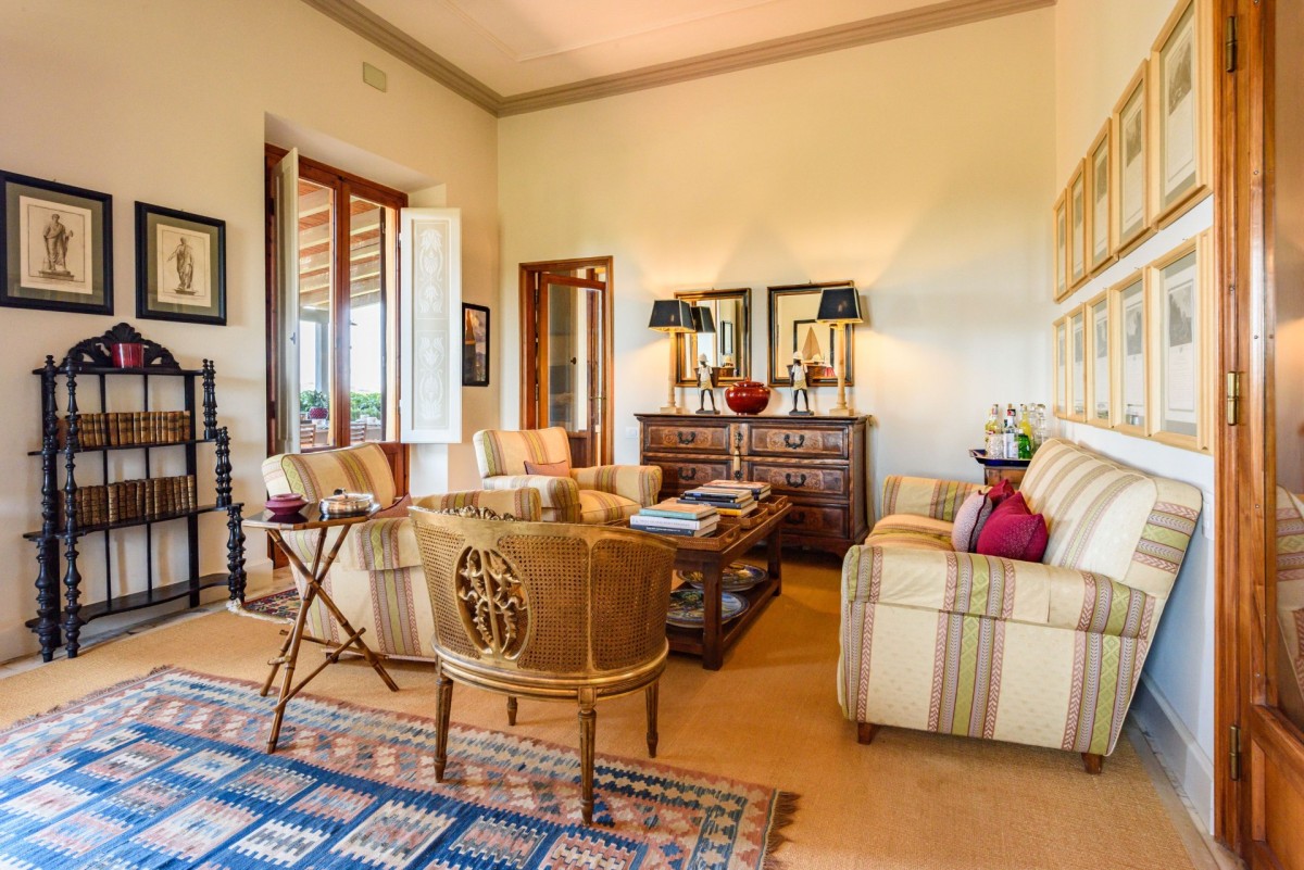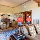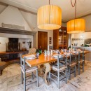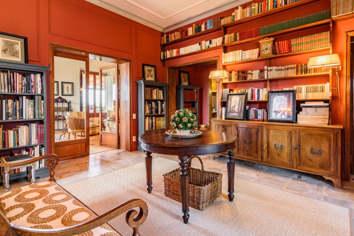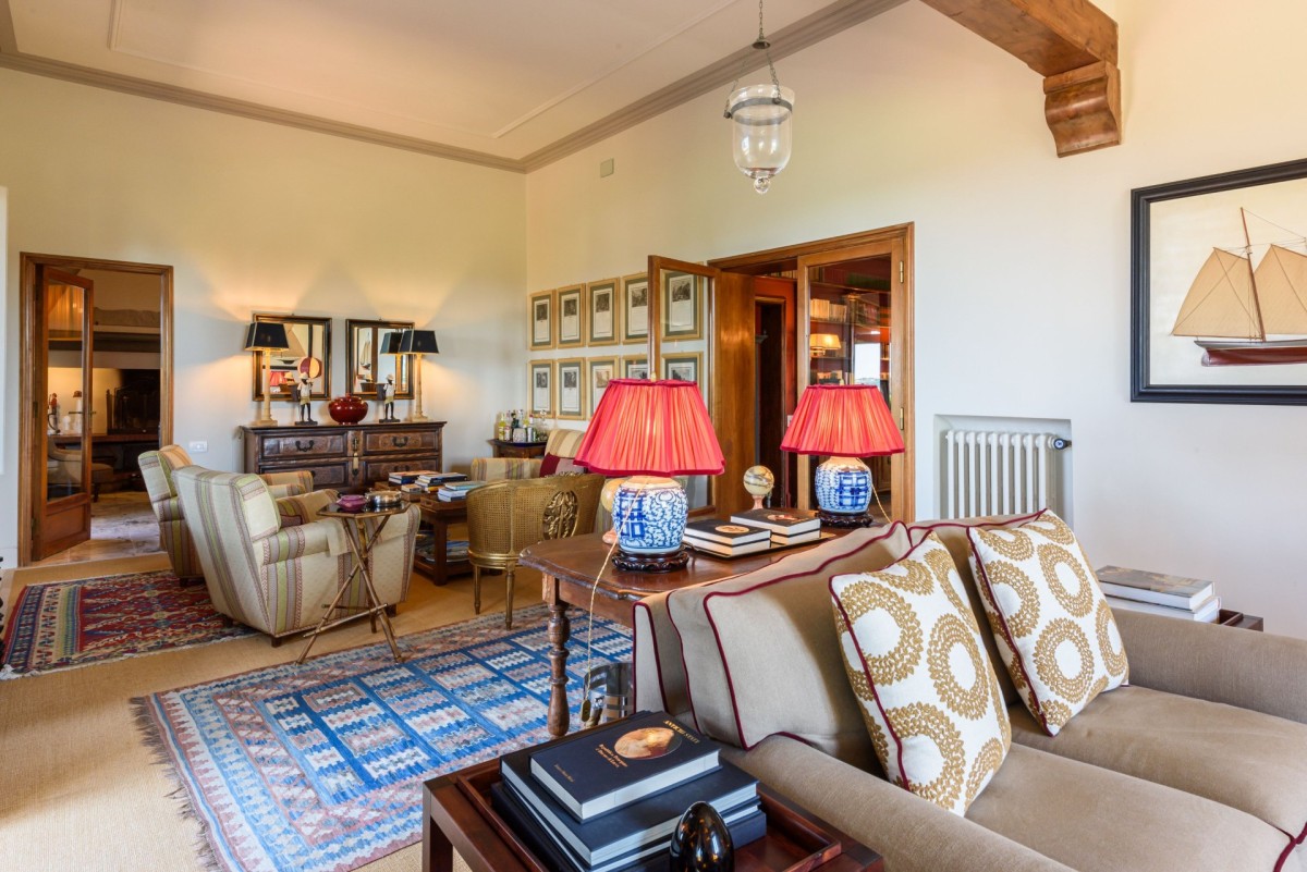 Elegantly furnished on a single level, the villa’s bright interiors include a cozy living room with sofas and a fireplace, a reading room with a wooden bookcase, and a spacious dining room with a large fireplace and seating for up to 12 guests. A fully equipped kitchen completes the living area.