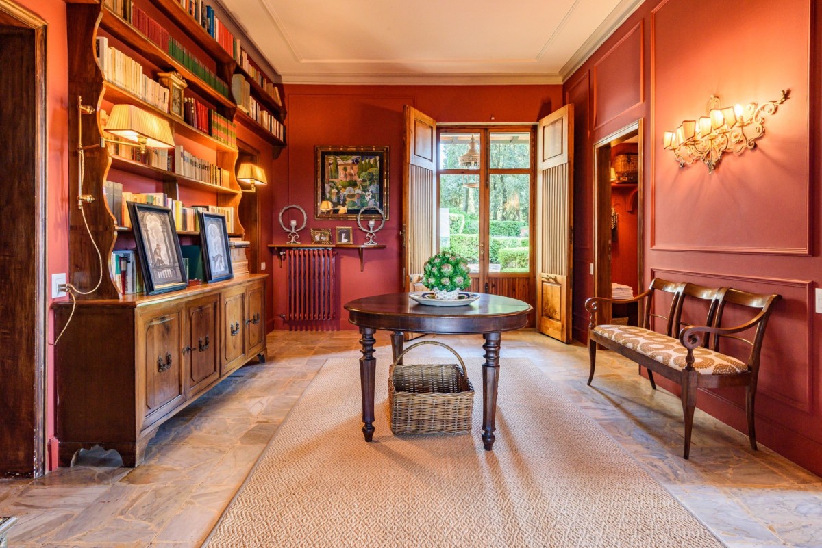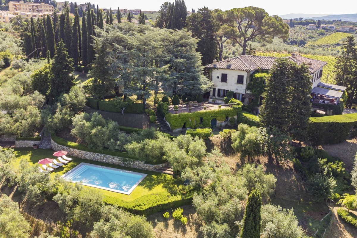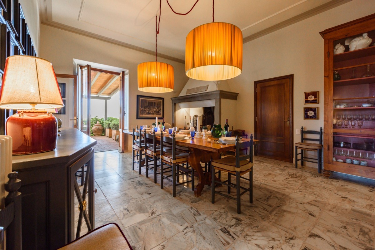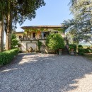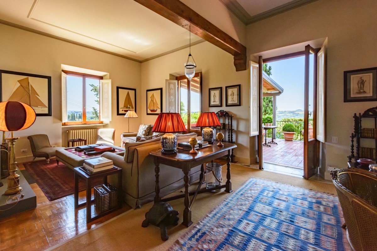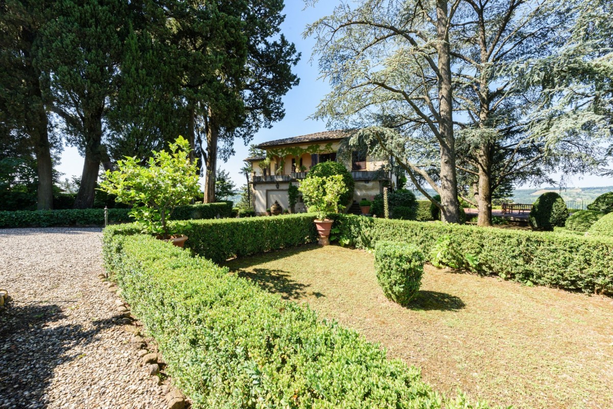 Dating back to the late 1700s, the property has been thoughtfully updated over the years, blending traditional charm with mid-20th-century architectural details. The private garden features boxwood-lined paths, mature trees, and a vegetable garden, while a covered terrace with a dining area and lounge offers panoramic views over the Pesa Valley, between Florence and Siena.