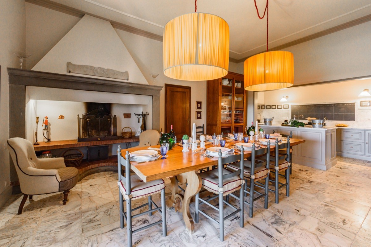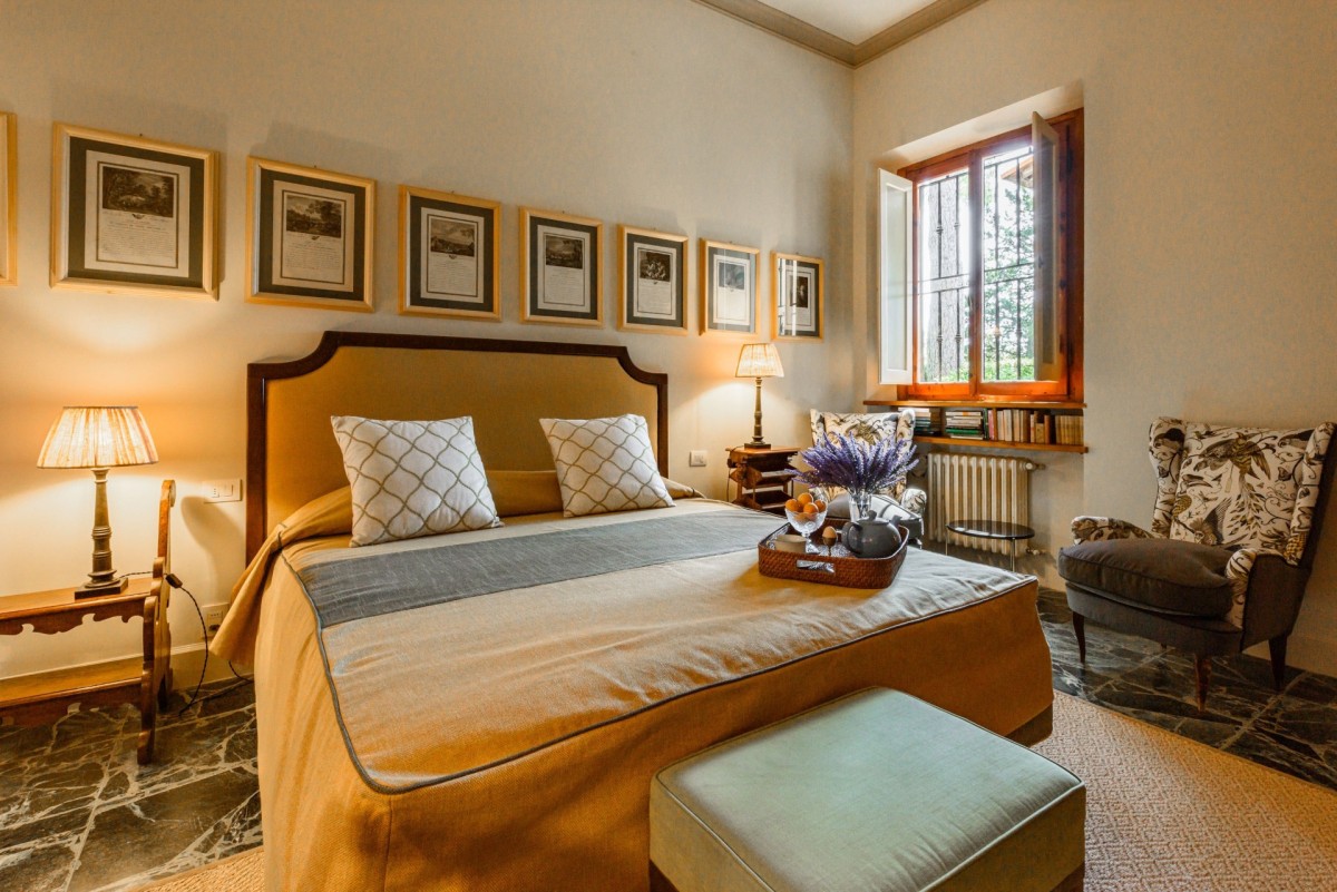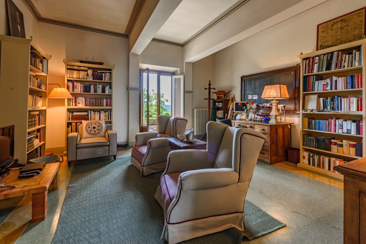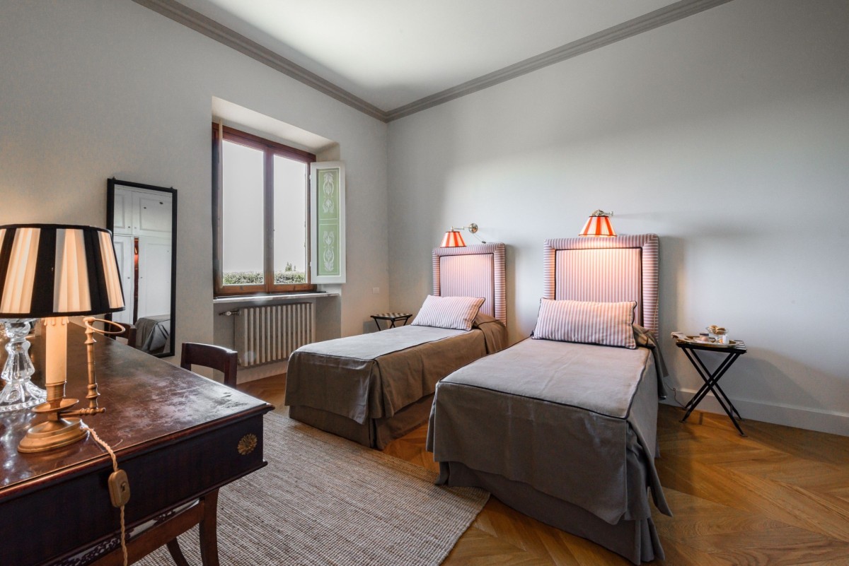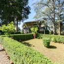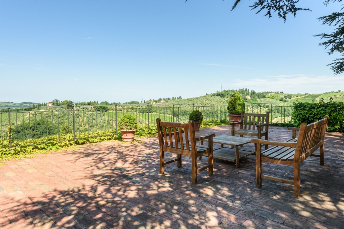 Dating back to the late 1700s, the property has been thoughtfully updated over the years, blending traditional charm with mid-20th-century architectural details. The private garden features boxwood-lined paths, mature trees, and a vegetable garden, while a covered terrace with a dining area and lounge offers panoramic views over the Pesa Valley, between Florence and Siena.