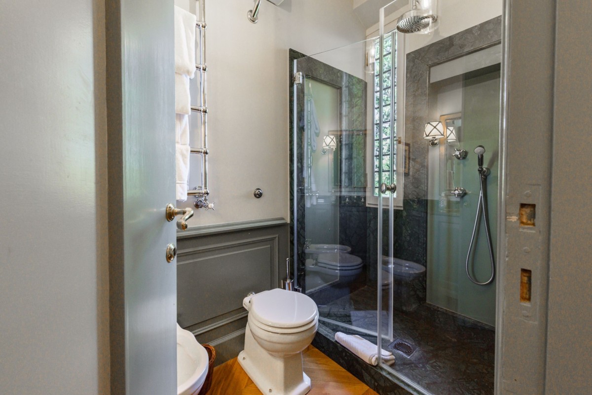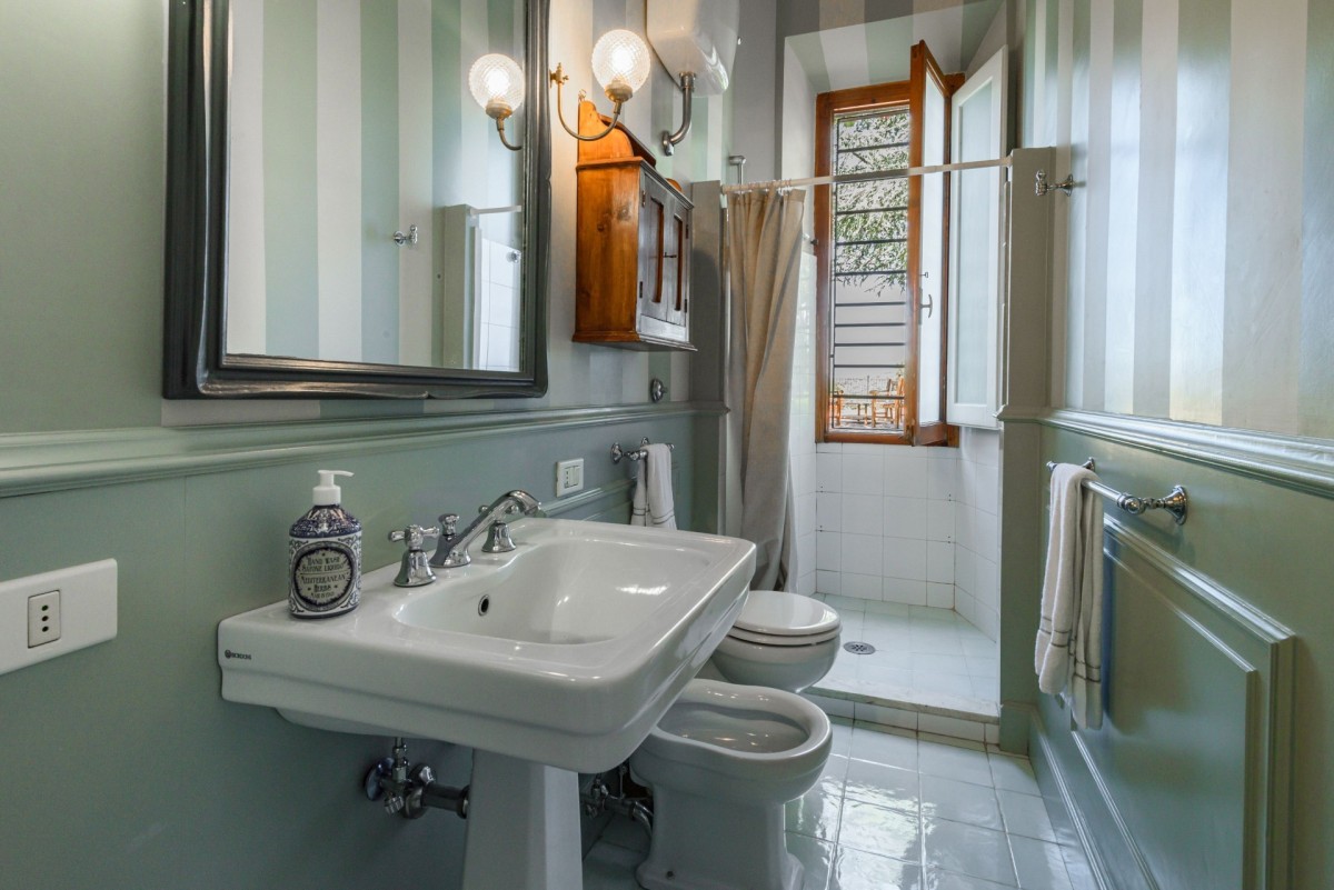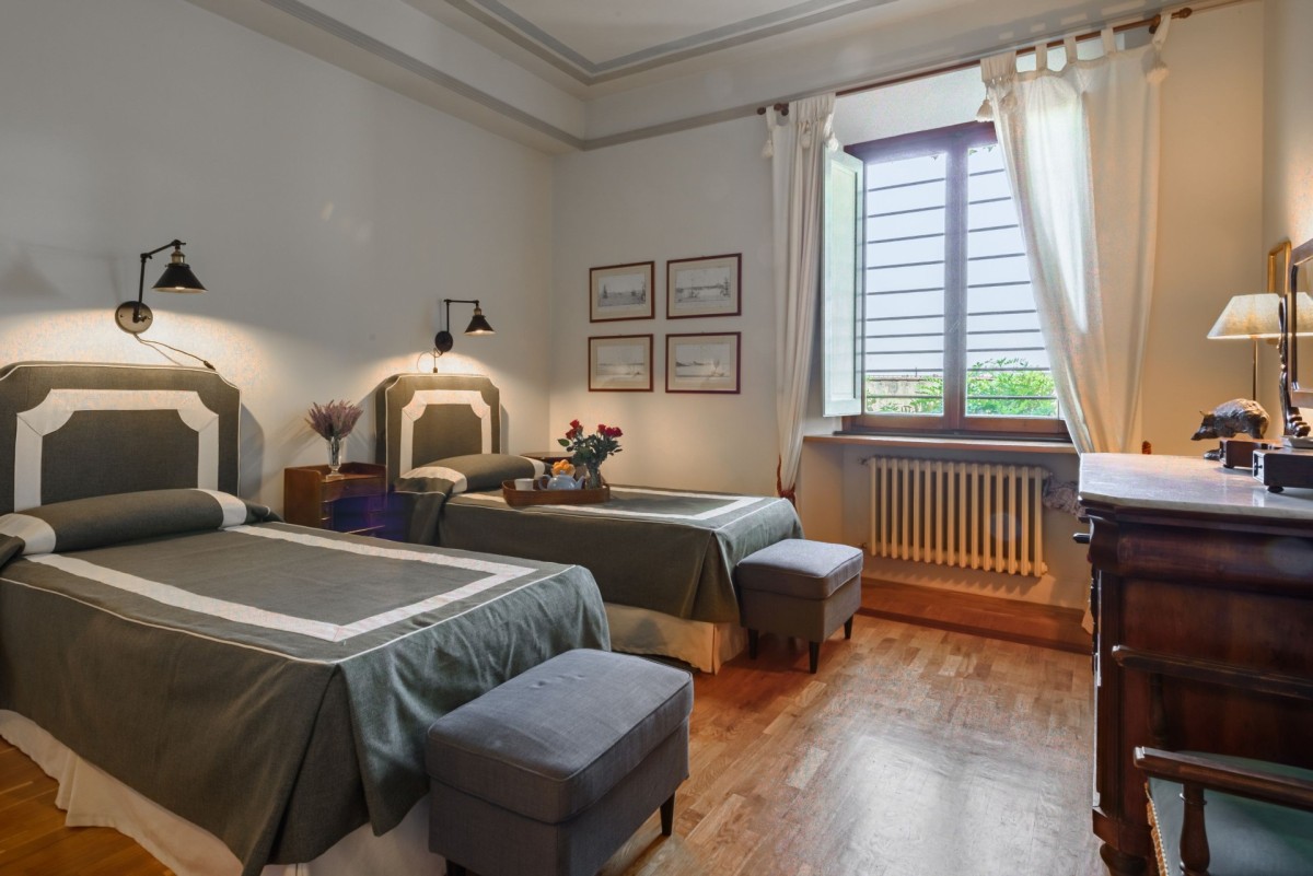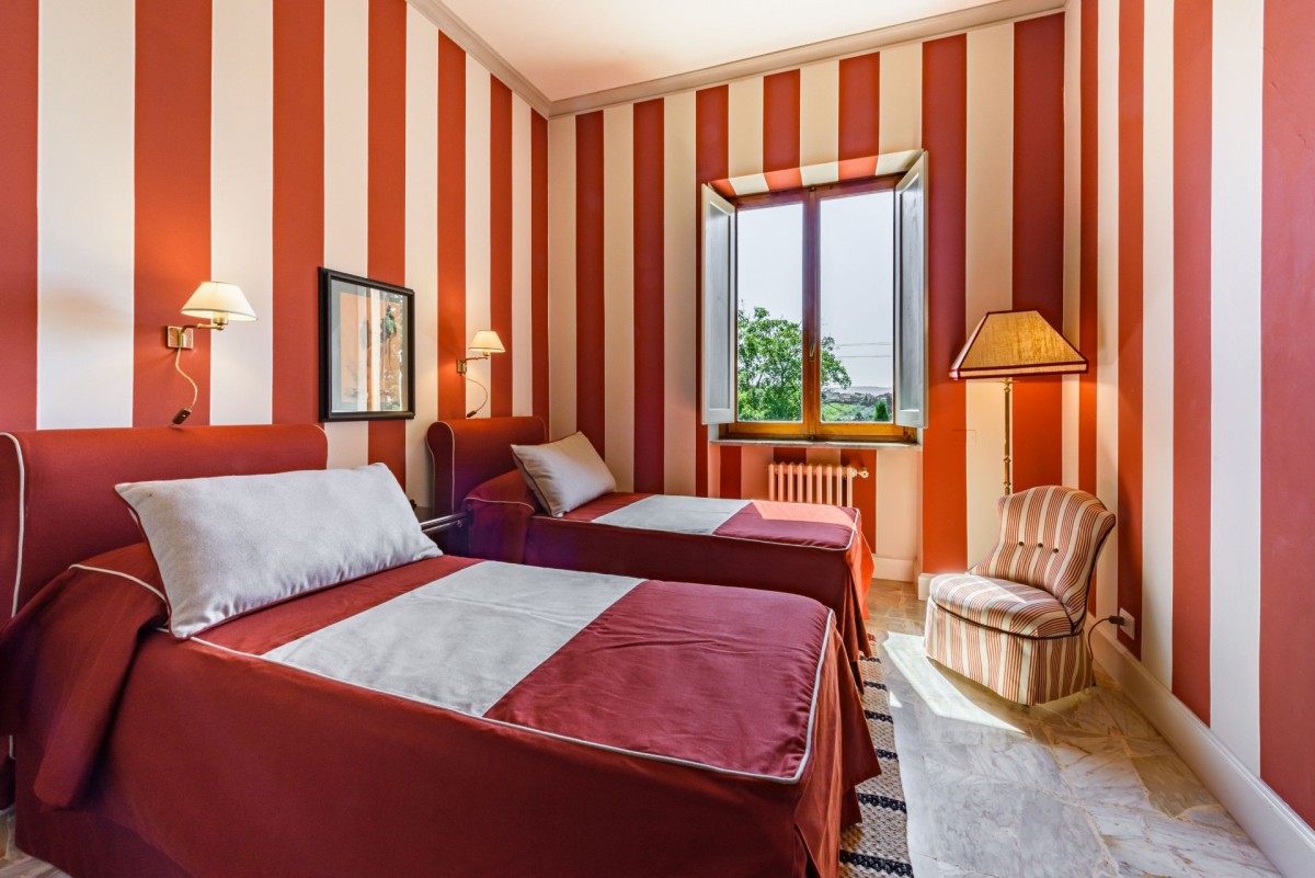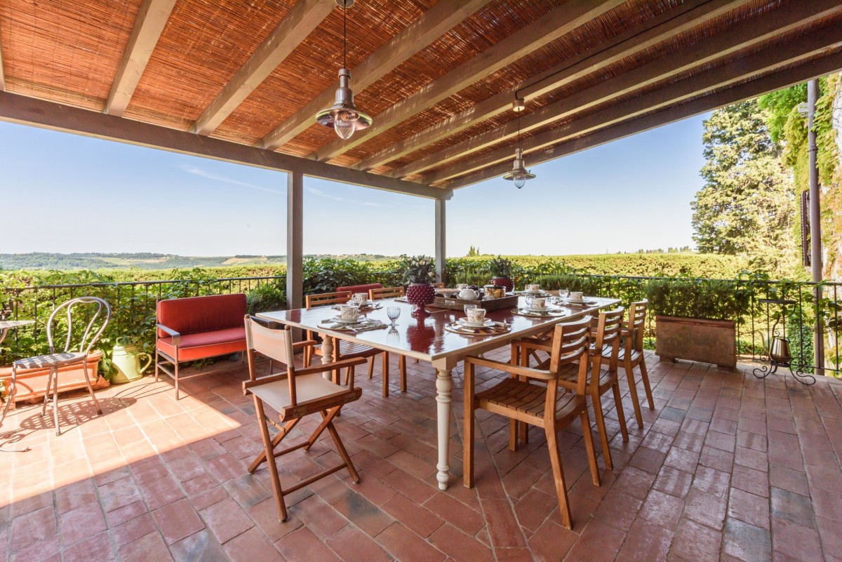 Dating back to the late 1700s, the property has been thoughtfully updated over the years, blending traditional charm with mid-20th-century architectural details. The private garden features boxwood-lined paths, mature trees, and a vegetable garden, while a covered terrace with a dining area and lounge offers panoramic views over the Pesa Valley, between Florence and Siena.