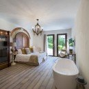 Bedroom 1: Ground floor bedroom with a double bed and en-suite bathroom with jacuzzi bathtub, shower, vanity, and wc. 2 guests maximum