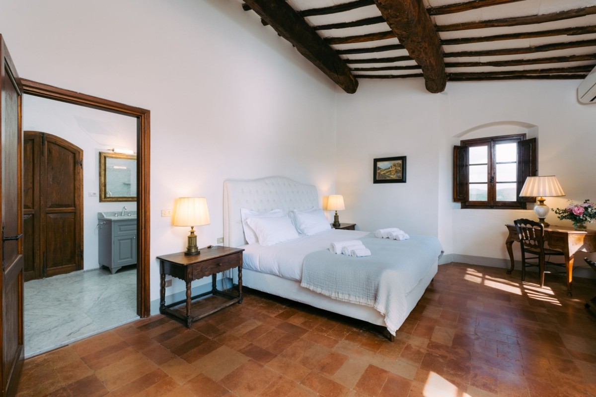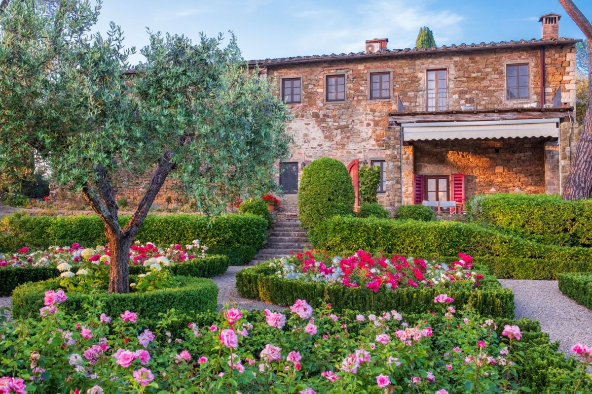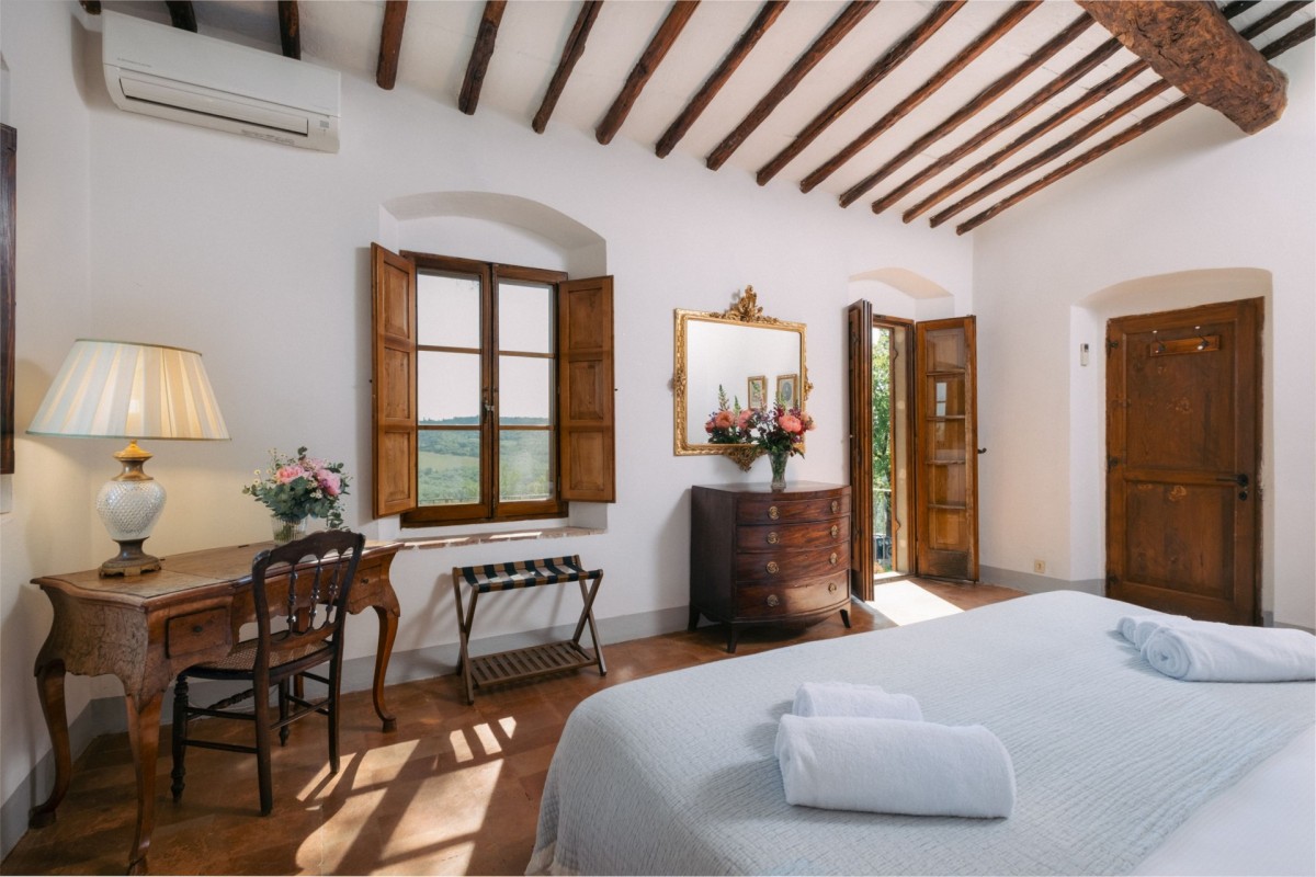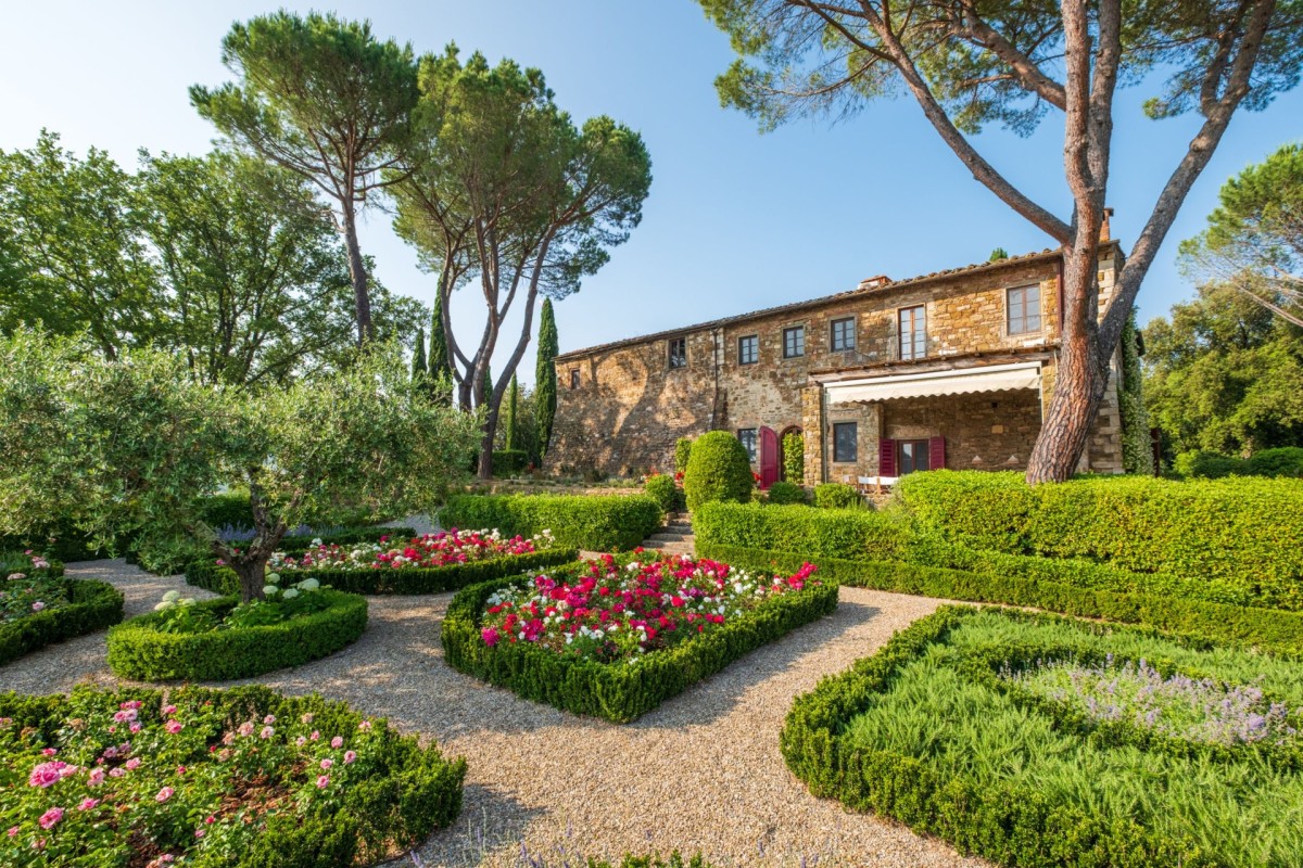 Villa la Corte is a wonderful estate with a private pool and tennis court, set amidst the rolling Chianti countryside near Greve in Chianti. Surrounded by 10 hectares of olive groves, vineyards, and gardens, this historic 12th-century villa offers an authentic Tuscan experience combined with elegant comfort. It can accommodate up to 18 guests, with a total of 9 bedrooms and 8 bathrooms.