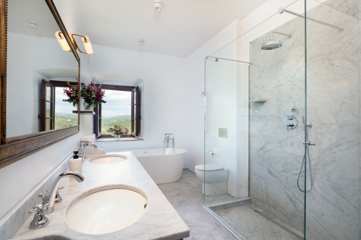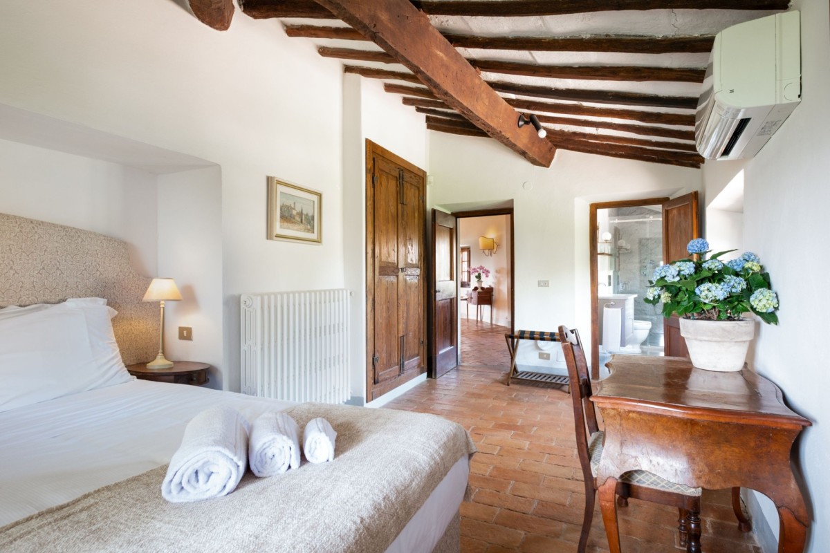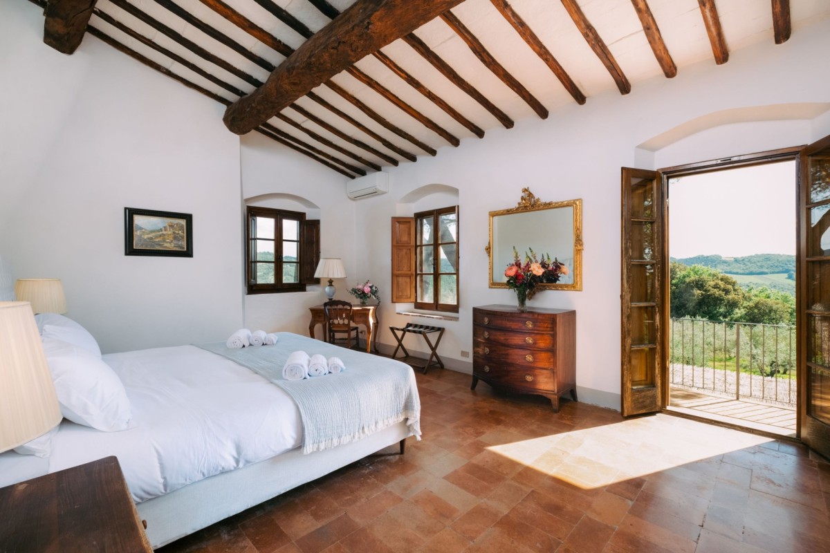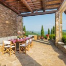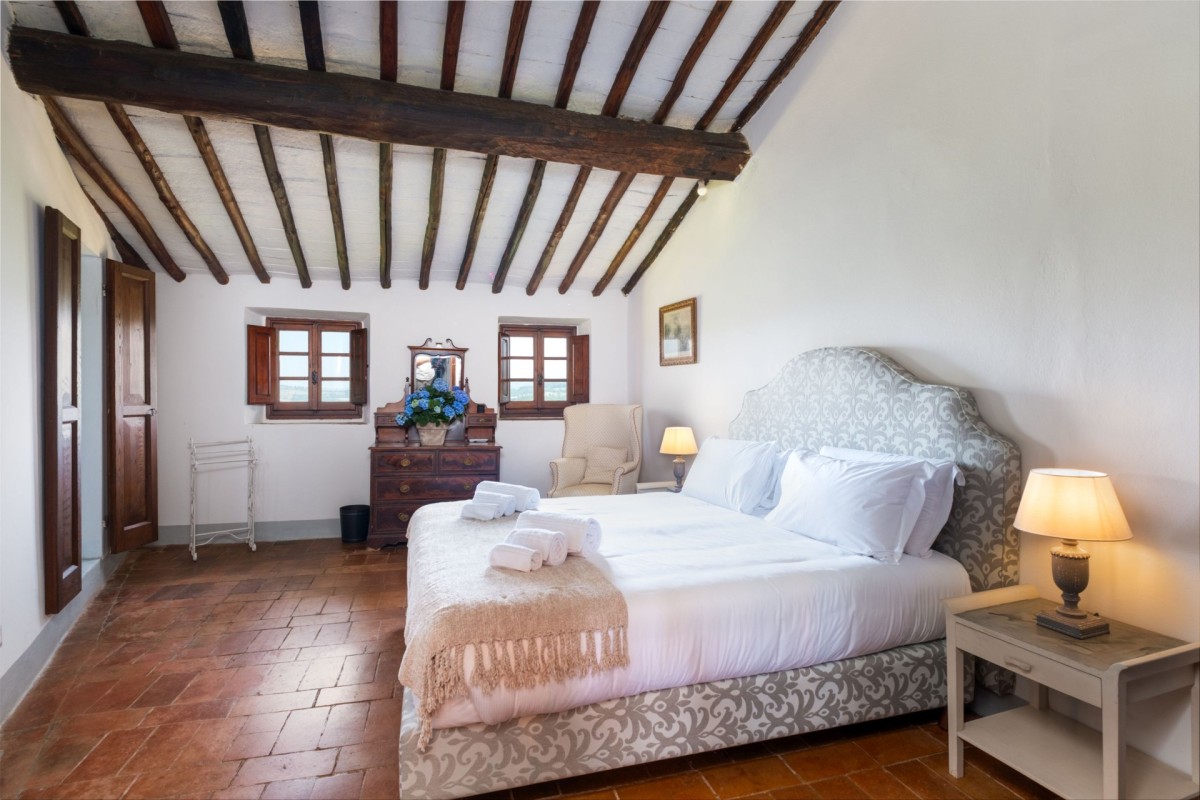 Villa la Corte is a wonderful estate with a private pool and tennis court, set amidst the rolling Chianti countryside near Greve in Chianti. Surrounded by 10 hectares of olive groves, vineyards, and gardens, this historic 12th-century villa offers an authentic Tuscan experience combined with elegant comfort. It can accommodate up to 18 guests, with a total of 9 bedrooms and 8 bathrooms.