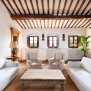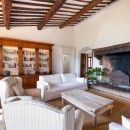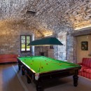 The main villa, spread across three floors, features welcoming living spaces that blend rustic charm with comfort. On the ground floor, guests are greeted by an impressive arched stone entrance hall, a fully equipped kitchen with modern appliances, a spacious dining room with a large wooden table and fireplace, and a cozy living room with sofas, a TV, and a games table. The same floor also includes a billiard room with snooker and darts, a laundry area with a washer and dryer, and a guest toilet. The upper floors house beautifully appointed lounges with fireplaces, bookshelves, and elegant décor, creating inviting spaces for reading or socializing.