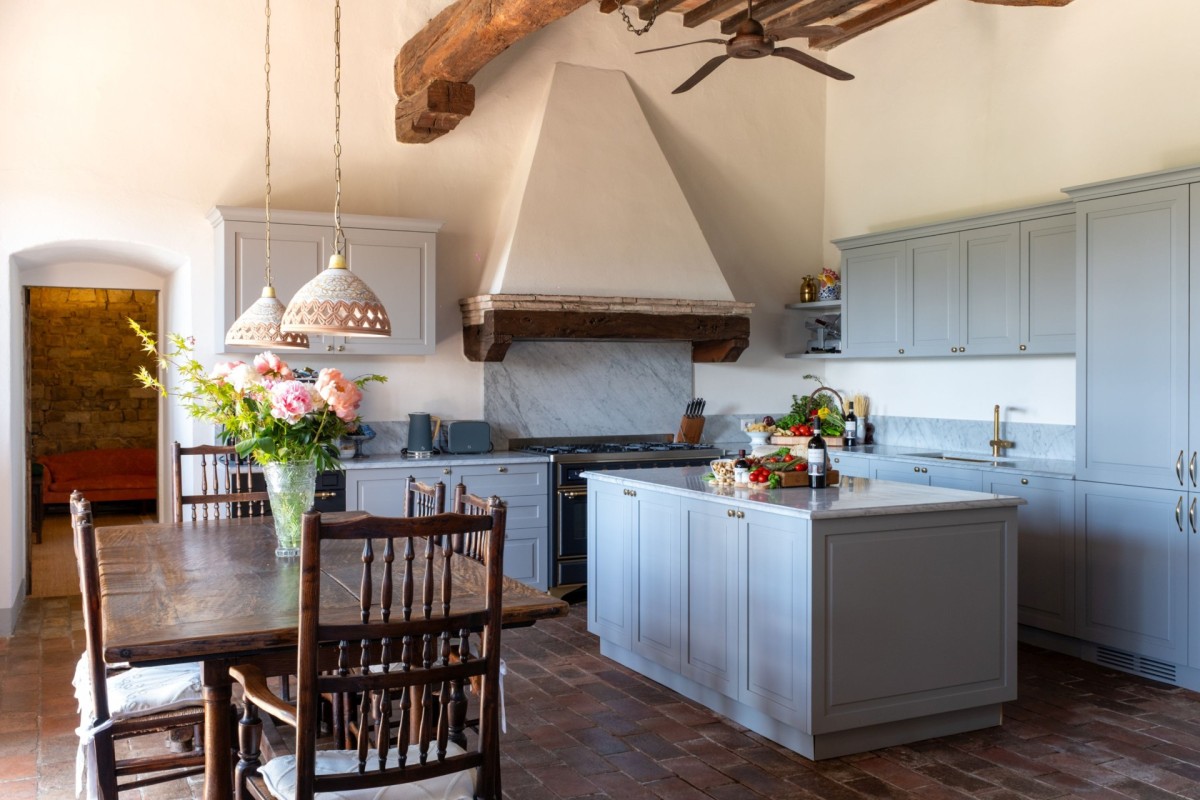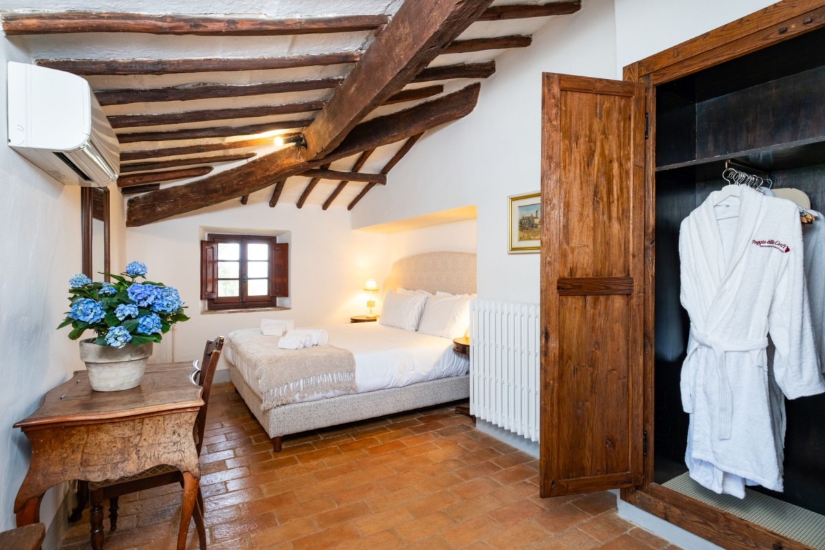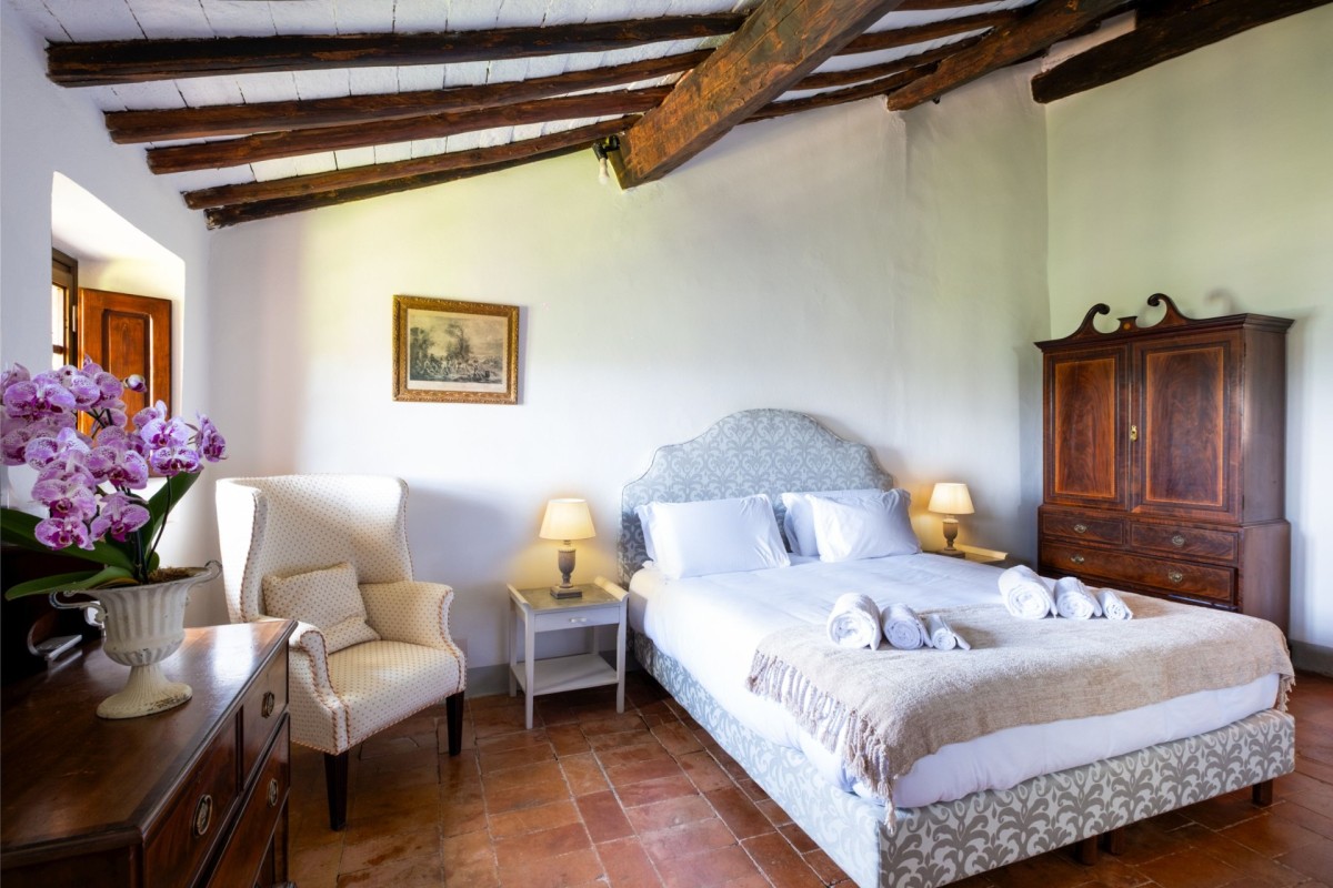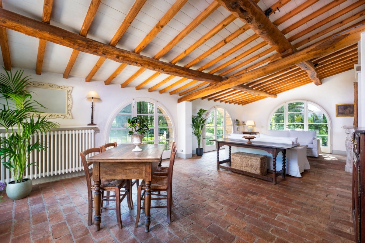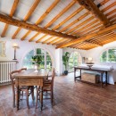 The annex, connected to the main villa, is arranged over two floors and includes its own kitchen and a covered veranda with a dining table, as well as an additional outdoor dining area in the garden—perfect for enjoying peaceful Tuscan evenings.