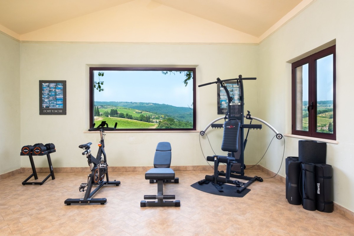 Immersed in nature, the villa boasts a spacious veranda with a large dining table overlooking the stunning Tuscan landscape—perfect for alfresco meals. The outdoor area also features a cozy lounge space ideal for relaxation, a charming stone-lined swimming pool (14 x 4.2 x 2.3 m) with sun loungers, umbrellas, a wet bar, and an outdoor shower. Guests can enjoy a wealth of leisure facilities, including a fenced Astroturf tennis court, bowling green, gym with fitness equipment and weights, and a ping pong table—all with equipment provided. Children can have fun on the enclosed trampoline. Ample private parking is available, and from the property, a nearby path connects directly to extensive walking and biking trails along the Fiume Pesa.