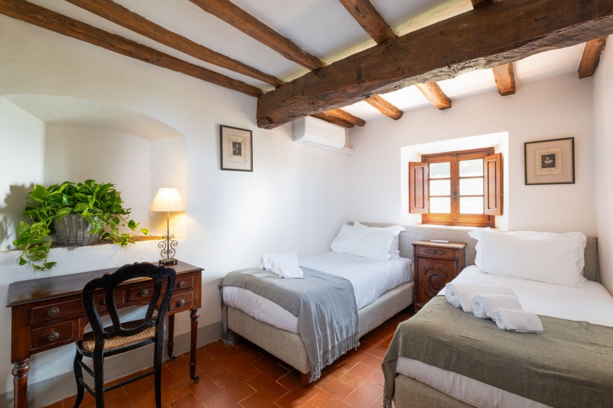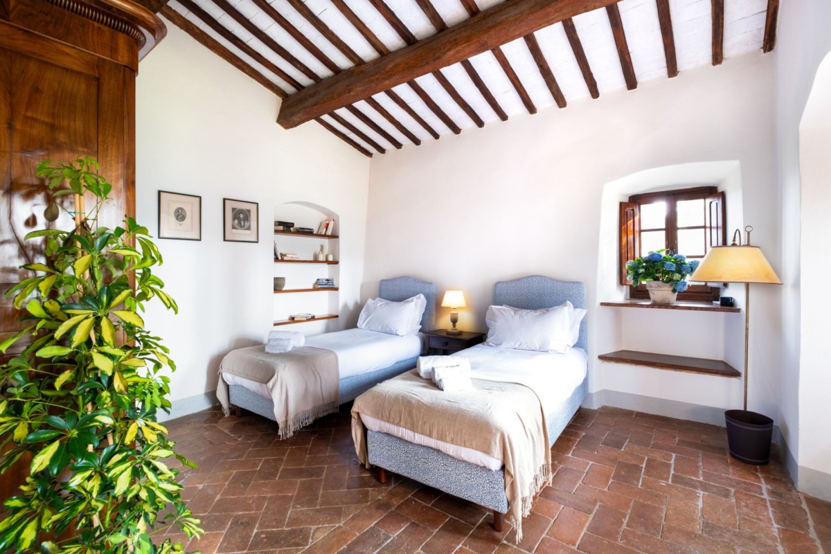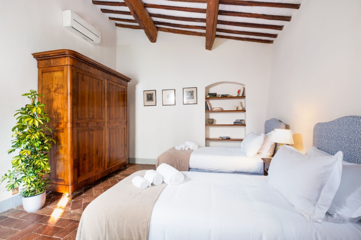 Bedroom 9: First floor bedroom with two single beds, A/C, WiFi, and en-suite bathroom with bathtub, vanity, bidet, and WC. 2 guests maximum.