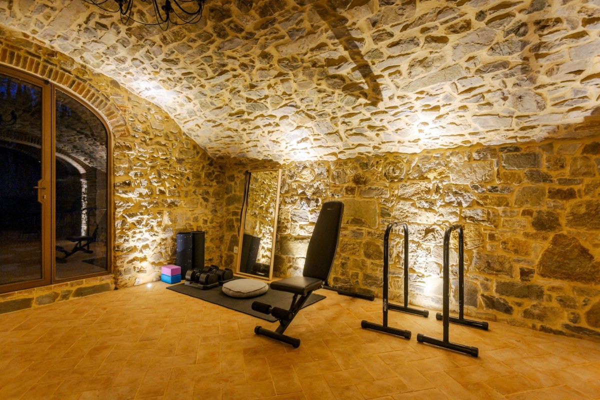 Set among rolling vineyards and olive groves, the villa was once a noble residence and an ancient watchtower during the historic conflicts between Siena and Florence. Today, it has been meticulously restored—almost entirely rebuilt—while remaining faithful to traditional Tuscan style. Stone exteriors, terracotta floors, and vaulted ceilings preserve its authentic character, seamlessly paired with modern comforts including underfloor heating and cooling, as well as a smart-home system.