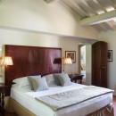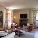 Inside, the villa features a warm and sophisticated atmosphere. The inviting sitting room, complete with a working fireplace, leather armchairs, and a plush designer-upholstered sofa, flows into a refined dining area furnished with high-end pieces. The custom-made kitchen is fully equipped and generously sized, ideal for preparing meals with local ingredients. Natural light pours through large windows, enhancing the harmonious blend of soft colors, luxurious fabrics, and elegant decor.