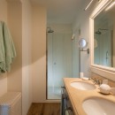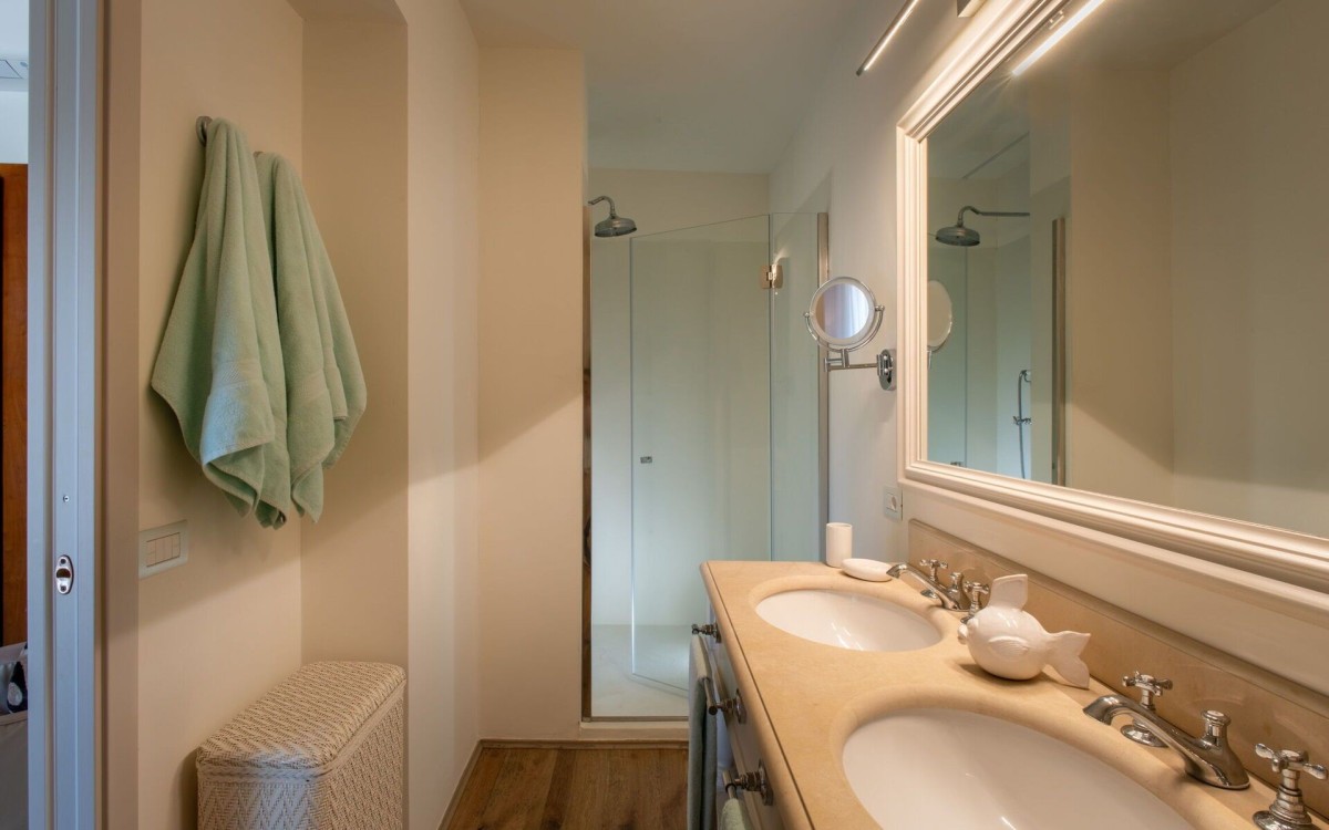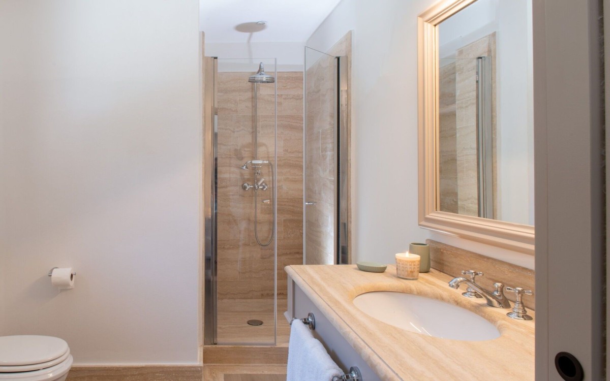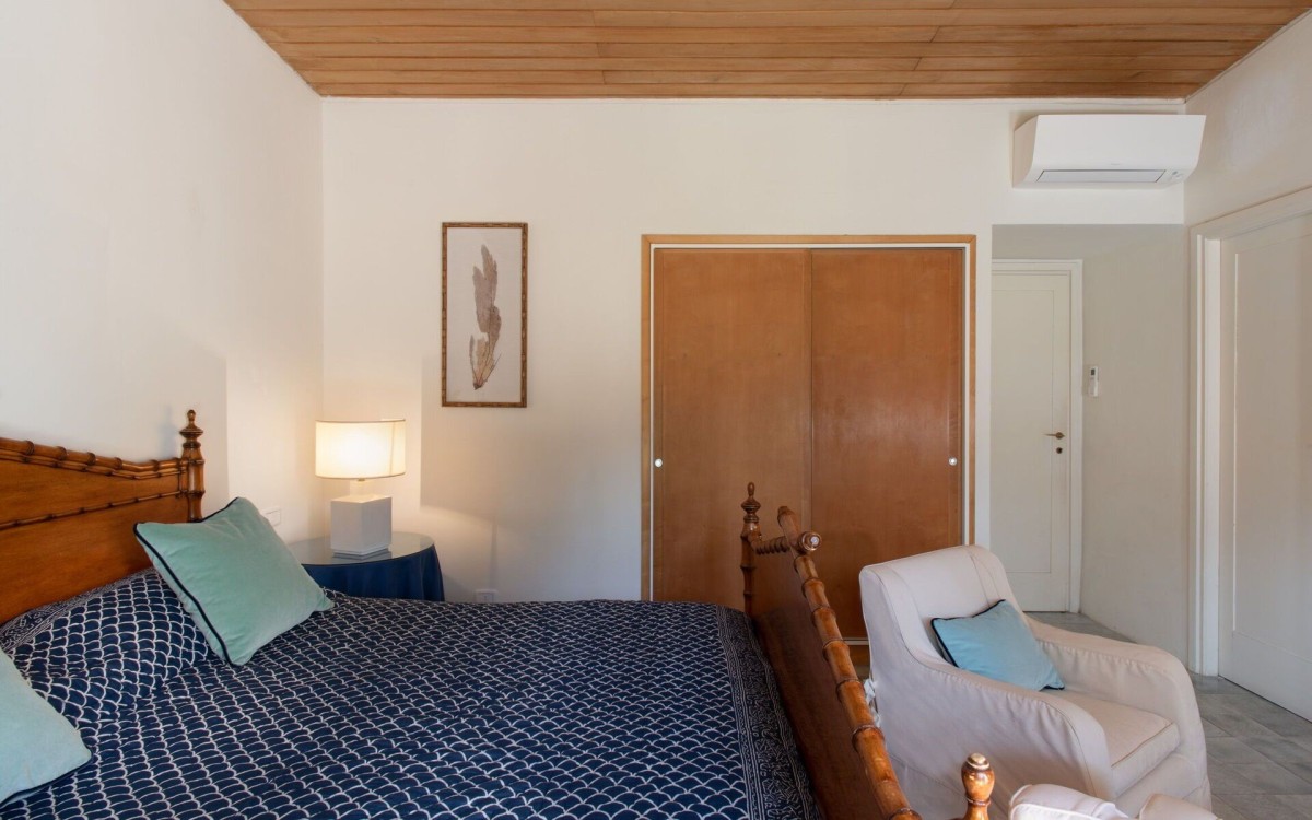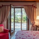Bedroom 5: Ground floor bedroom with a king-size bed, A/C, WiFi, working desk, armchair, access to terrace, and en-suite bathroom with shower, double vanity, bidet, and WC. 2 guests maximum.