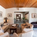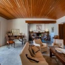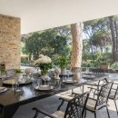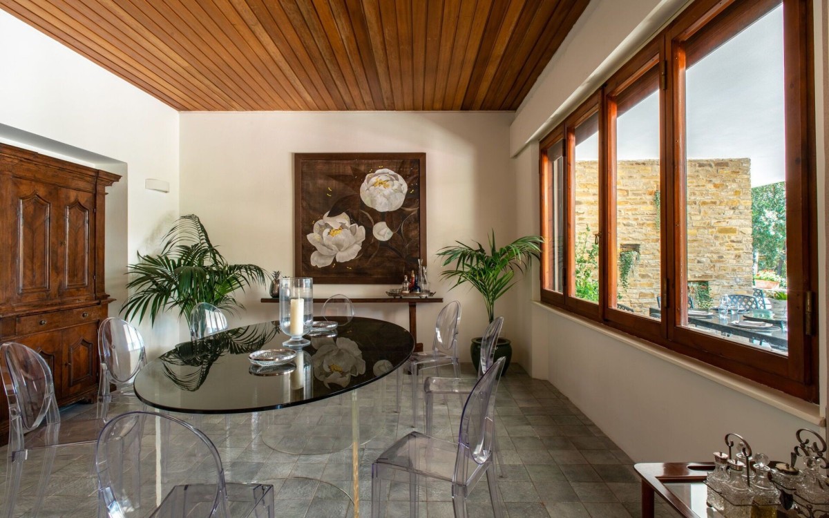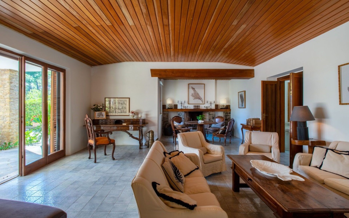 Inside, the main entrance opens onto an elegant living and dining area with a fireplace, a study, and a TV room. Large French windows illuminate the dining room and provide access to the terrace on the beachfront side, where two lounge areas and a large outdoor dining table create a perfect setting for open-air living. A newly designed kitchen connects to a more intimate outdoor dining and relaxation space. The terrace wraps around the villa, enhancing the brightness and flow of the interiors. The main floor hosts seven master bedrooms with en-suite bathrooms.