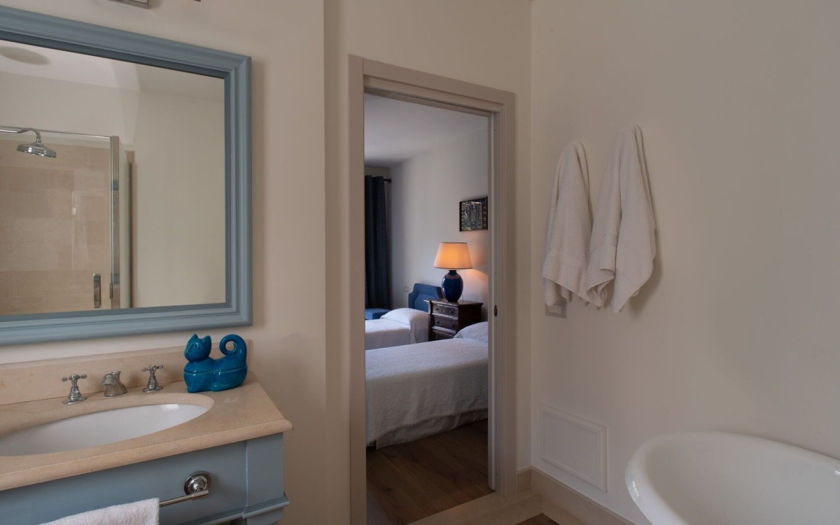Bedroom 4: Ground floor bedroom with a king-size bed, A/C, WiFi, working desk, armchair, access to terrace, and en-suite bathroom with bathtub, shower, vanity, bidet, and WC. 2 guests maximum.
