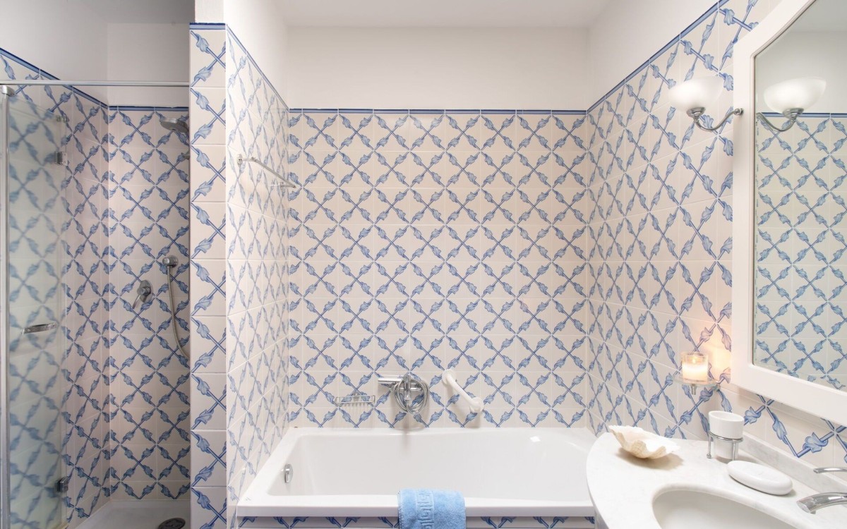 Bedroom 6: Ground floor bedroom with a king-size bed, A/C, WiFi, working desk, armchair, access to terrace, and en-suite bathroom with bathtub, shower, vanity, bidet, and WC. 2 guests maximum.