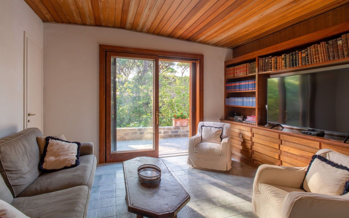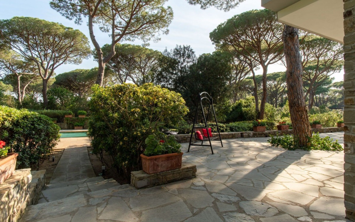 The property is enveloped by lush lawn, mature pine trees, and a spacious stone terrace adorned with geraniums. On the beachfront side, a large patio overlooks the pool, and a private path of about 90 meters leads directly to the beach, where guests have a reserved beach bungalow and changing area. The villa is conveniently located near Castiglione della Pescaia, in the heart of the Maremma region, close to seaside resorts, archaeological sites, nature parks, renowned spas, tennis clubs, and prestigious golf courses such as Punta Ala, Pelagone, and Argentario.