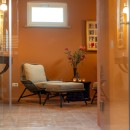 Bedroom 5: Orange bedroom with a queen-size bed, and en-suite bathroom with shower, double vanity, and WC. 2 guests maximum.