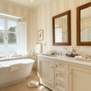 Bedroom 1: Pink bedroom with a king-size bed, and en-suite bathroom with bathtub/shower, double vanity, and WC. 2 guests maximum.