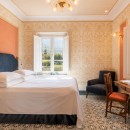 Bedroom 6: Green bedroom with a queen-size bed, and en-suite bathroom with shower, double vanity, and WC. 2 guests maximum.
