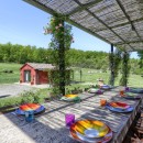 The estate comprises a two-story house situated on four hectares of land, with two hectares securely fenced. The ground floor features an expansive 80-square-meter living room and a dining area, complemented by an outdoor patio for alfresco dining, complete with a pizza oven. A modern, fully equipped kitchen awaits, boasting two ovens, a microwave, two dishwashers, a spacious fridge, freezer, ice machine, and a dedicated laundry room housing two washing machines and a dryer. Additionally, the ground floor houses a generously-sized bedroom with an en-suite bathroom featuring both a shower and a bathtub, with direct access to the garden. A guest bathroom completes this level.