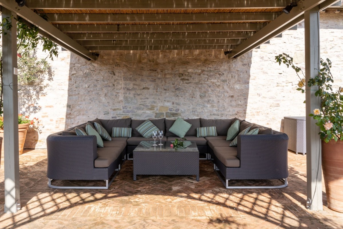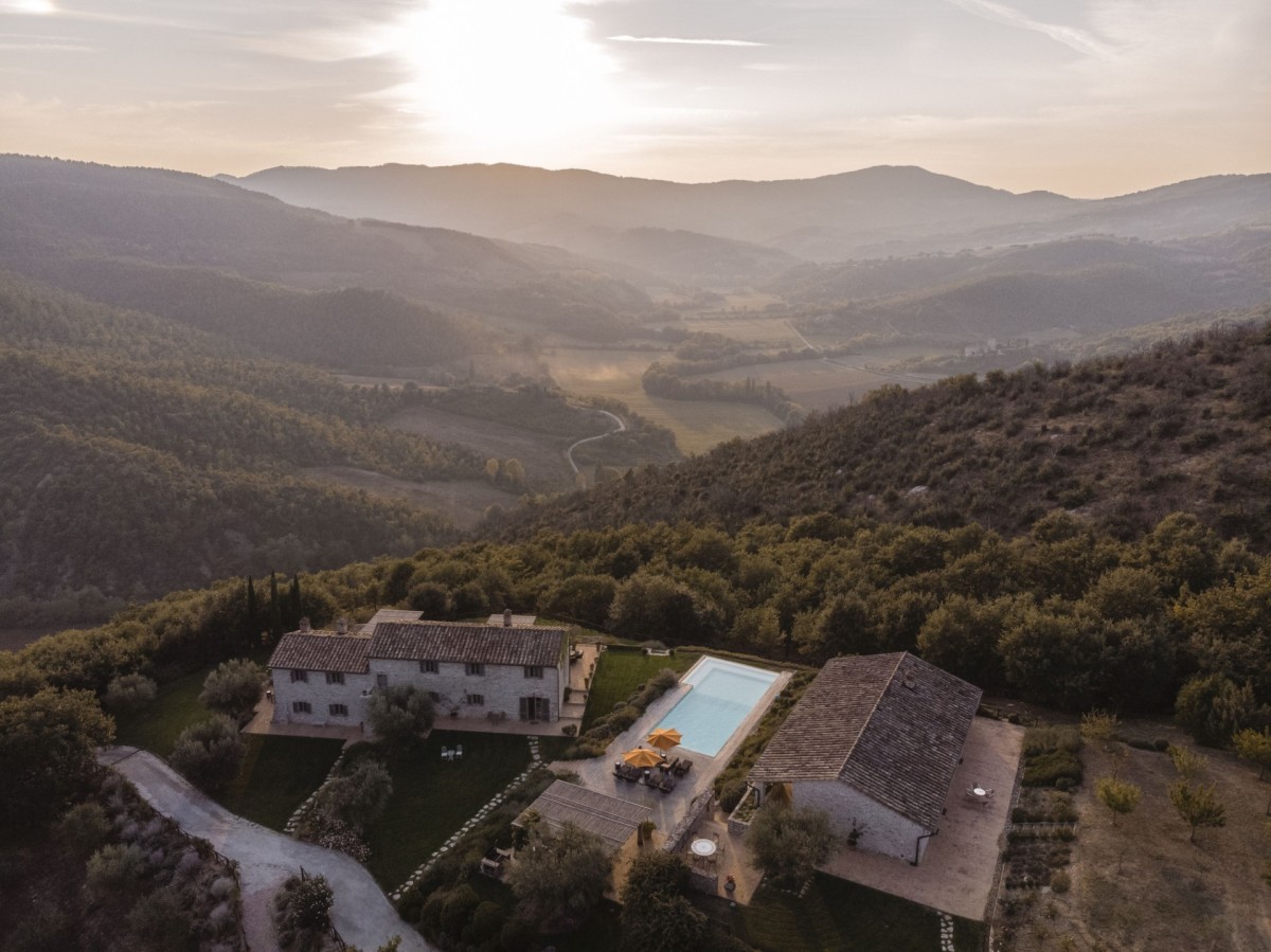Villa Monticelli is an exquisite renovated farmhouse perched on the hills of the Antognolla Golf Course. Its strategic position offers breathtaking views of the Umbrian countryside and its rolling hills. Even the road that leads to the villa is unforgettable, offering glimpses of the majestic Antognolla Castle, which dates back to the 11th century. The villa’s traditional exterior, framed by century-old olive trees, opens into modern and elegant interiors. An impressive infinity pool looks out over the landscape, creating a truly cinematic setting. Expansive terraces and a shaded pergola provide the ideal spots for relaxed breakfasts, leisurely lunches, and sunset aperitivos, all immersed in the tranquil atmosphere unique to this corner of Umbria. The villa is perfectly suited for a memorable family holiday or a countryside escape with friends.