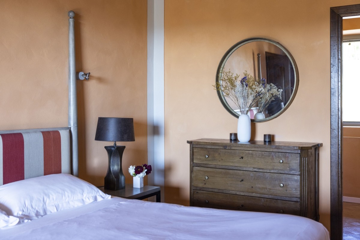 Bedroom 1: Underground floor bedroom with a king-size bed, A/C, WiFi, exterior access, and shared bathroom with shower, vanity, and WC. 2 guests maximum.