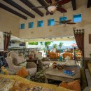 The kitchen, dining area, and bar are equipped with top-of-the-line appliances and furnishings designed for discerning tastes. Casa Alcini is elegantly appointed, featuring a color palette of soothing beiges and creams accentuated by carefully chosen artwork. Indoor entertainment is readily available, with a comprehensive media center and inviting built-in terracotta-style seating.