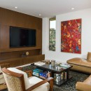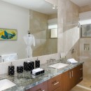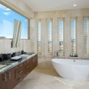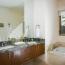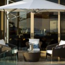 Pacific West's outdoor spaces exude sophistication and evoke the ambiance of a trendy resort. The terrace is shaded by crisp white umbrellas, and it features lounge beds and casual seating areas. Additionally, there is a lush green lawn on the lower level, a collection of private patios and terraces attached to the bedrooms, and a spacious main terrace that houses the stunning, elegant pool. The pool, with its long, sinuous design, a short infinity edge, and a series of waterfalls cascading from the stone facade, resembles a luxurious Roman bath.