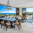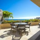 Expansive glass windows offer panoramic ocean views from every corner of the open-concept living and dining area. A glass-topped dining table mirrors the blues of the sea and sky, inviting formal dining for eight in a stunning setting. These windows open onto the main terrace, where guests can prepare a sumptuous feast on the top-tier gas BBQ and then dine under the stars at the outdoor table.